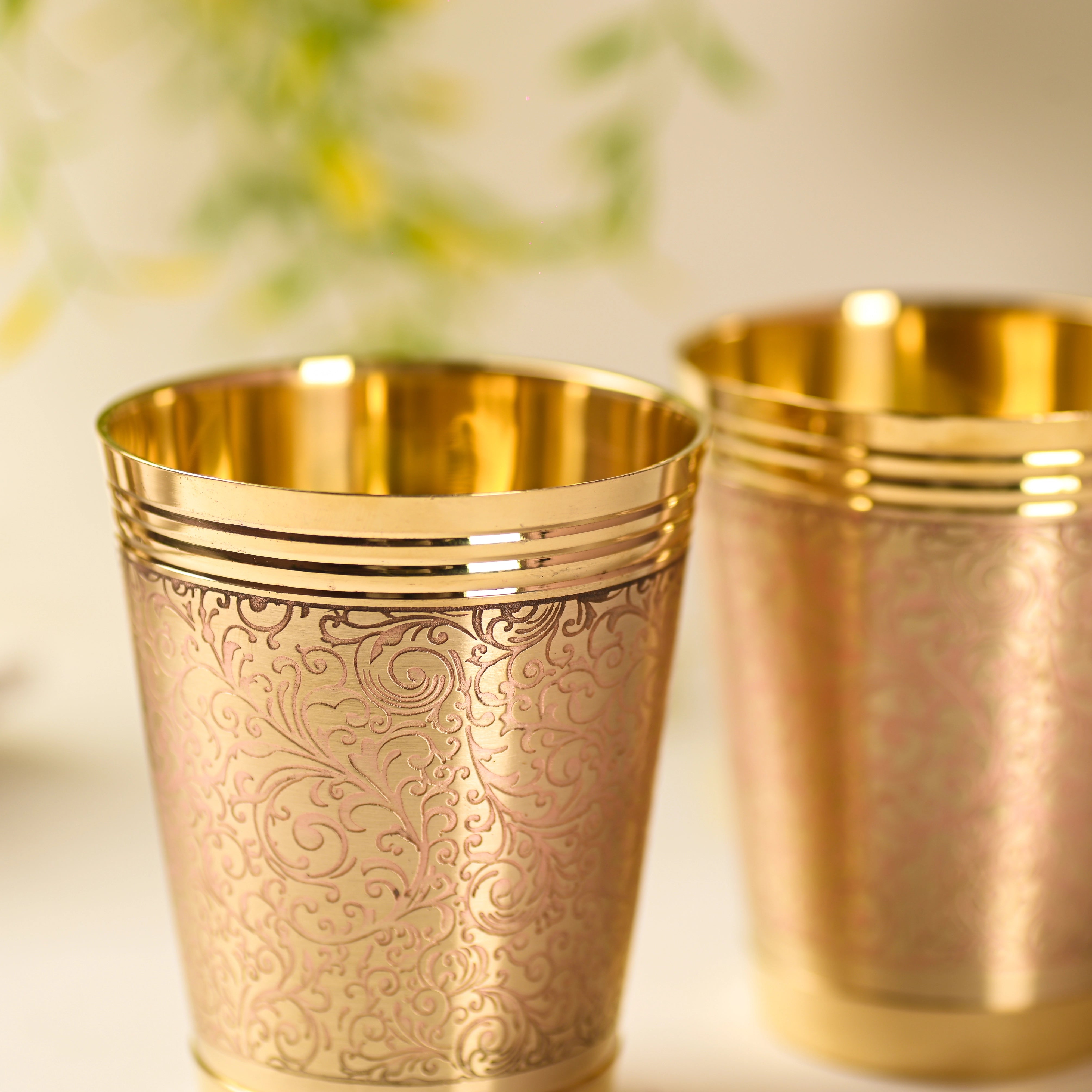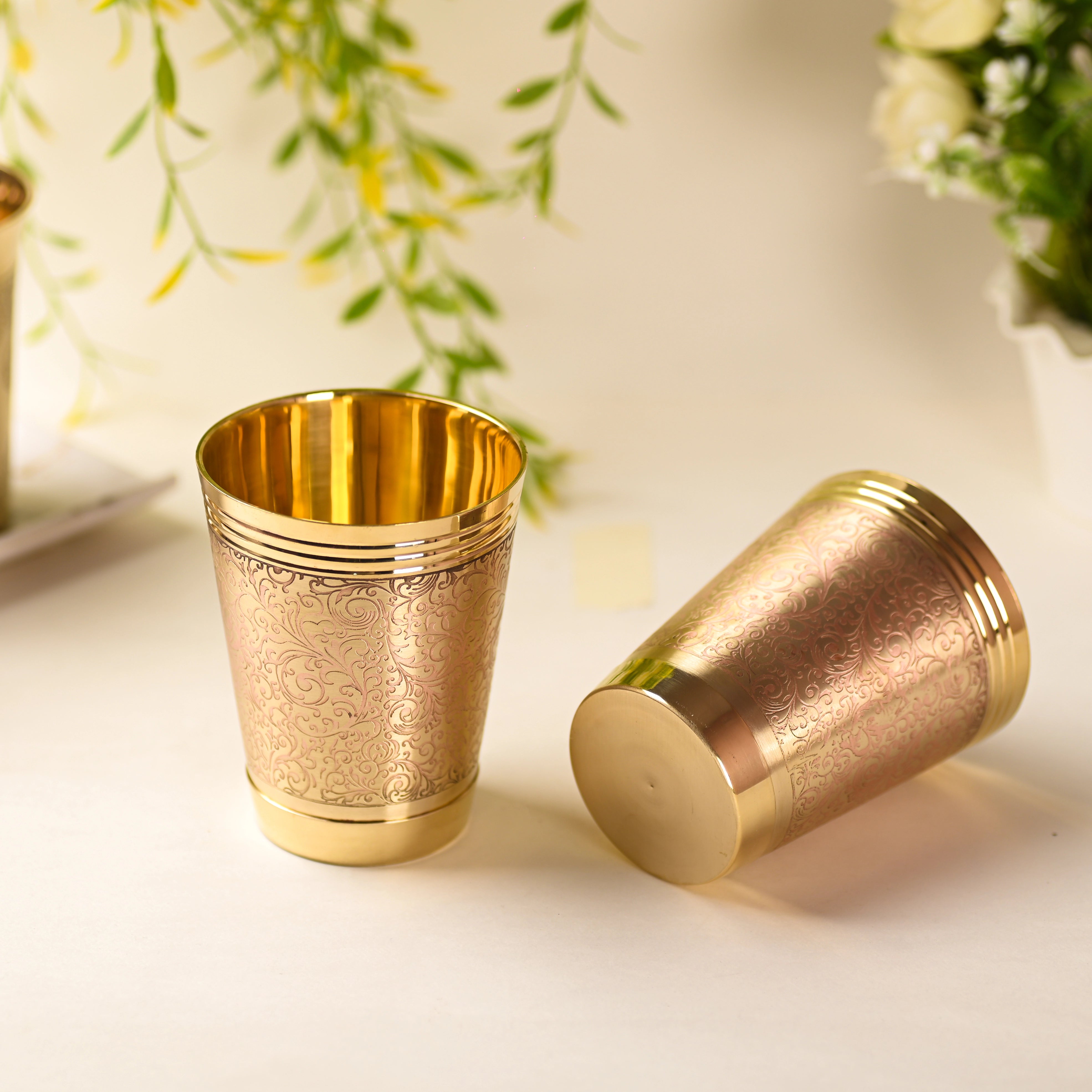 Perfect for serving water, milk, or festive beverages, these brass glasses are also revered in Indian tradition for their believed health and spiritual benefits. Their solid weight and balanced design ensure comfortable everyday use while adding a touch of regal charm to your table setting, pooja room, or gifting collection.