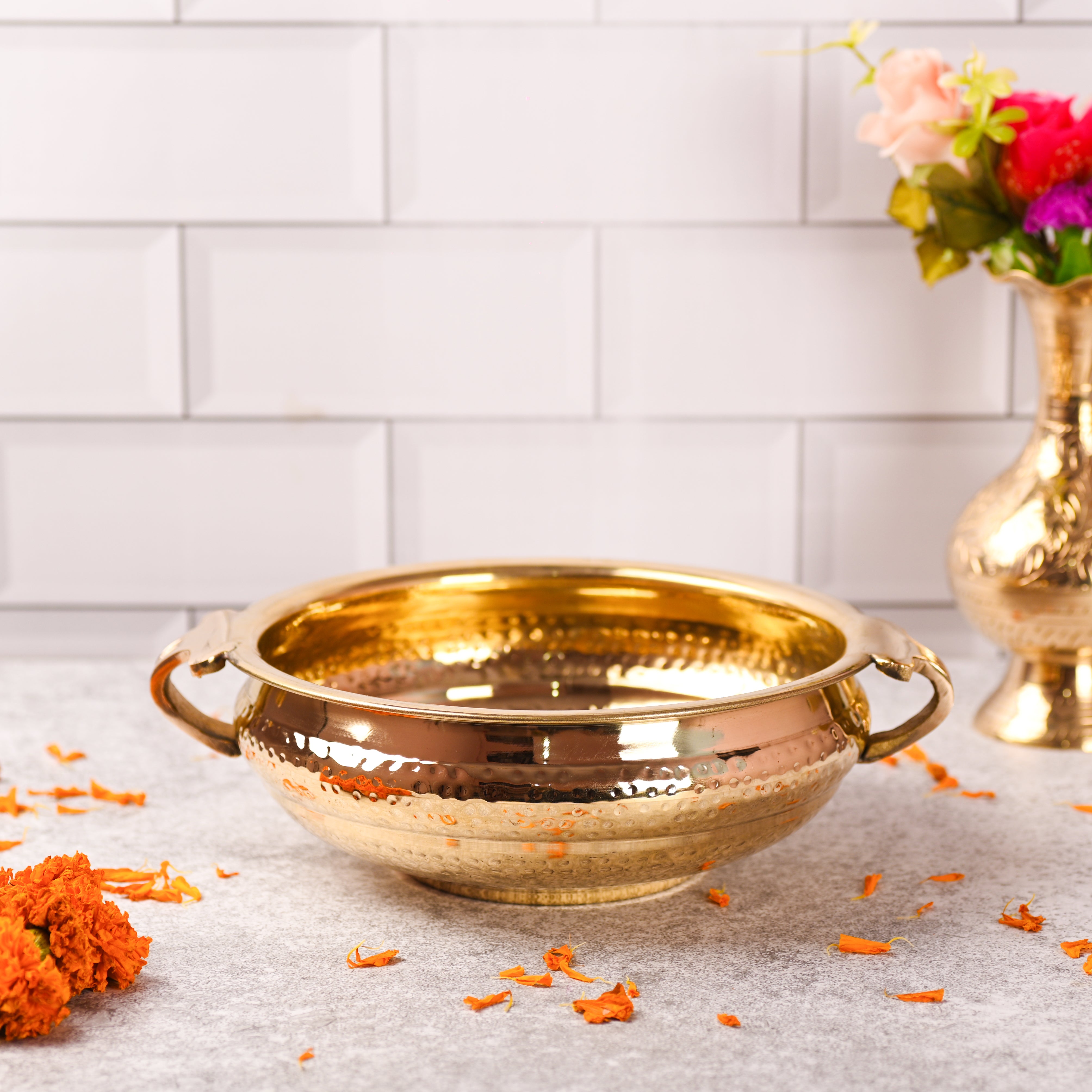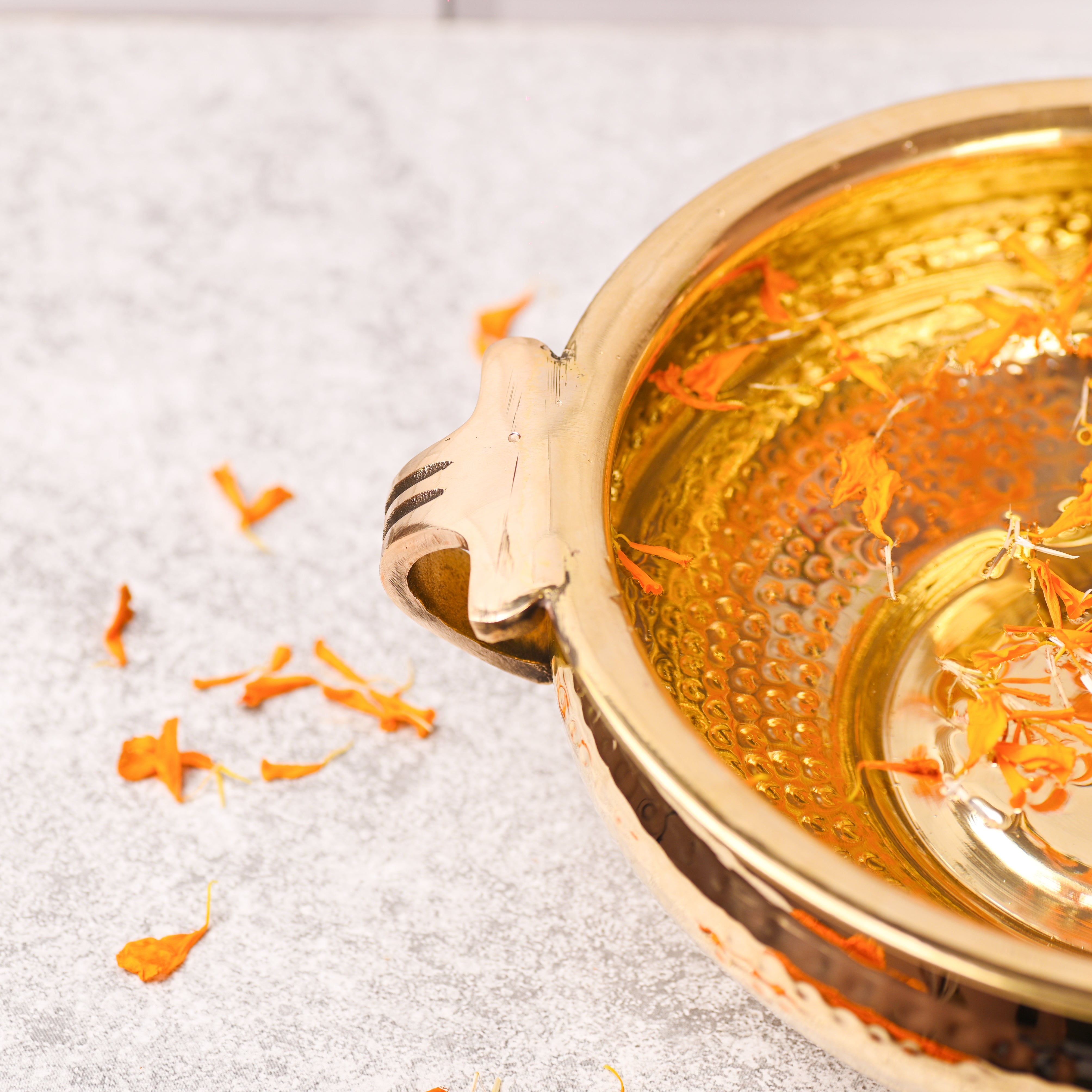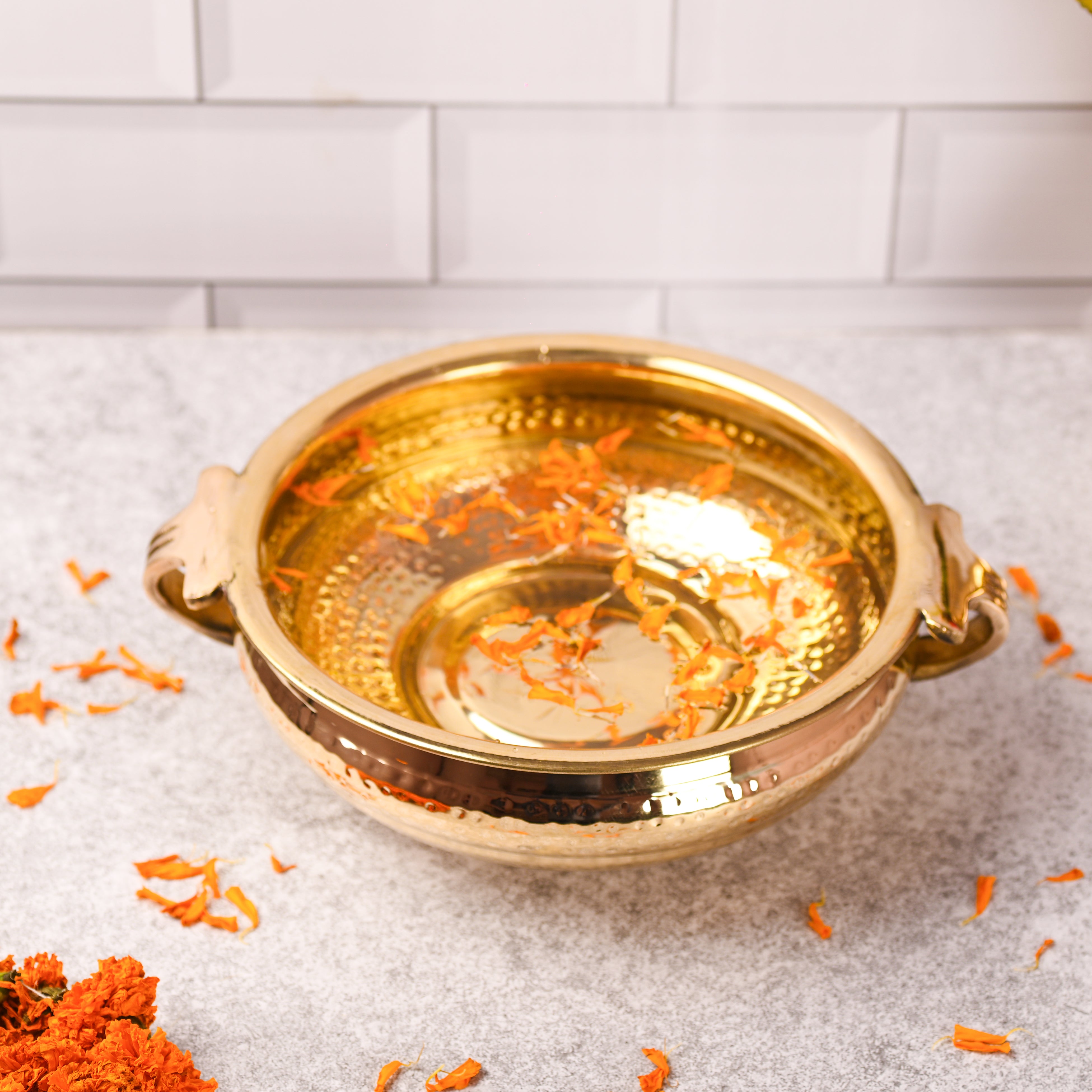 Add a touch of timeless elegance to your home with this Brass Traditional Hammered Urli/Floater, beautifully handcrafted by skilled Indian artisans. Featuring a classic hammered texture and a gracefully rounded form, this urli reflects the rich cultural heritage of traditional Indian brassware and the artistry of authentic brass handicrafts.