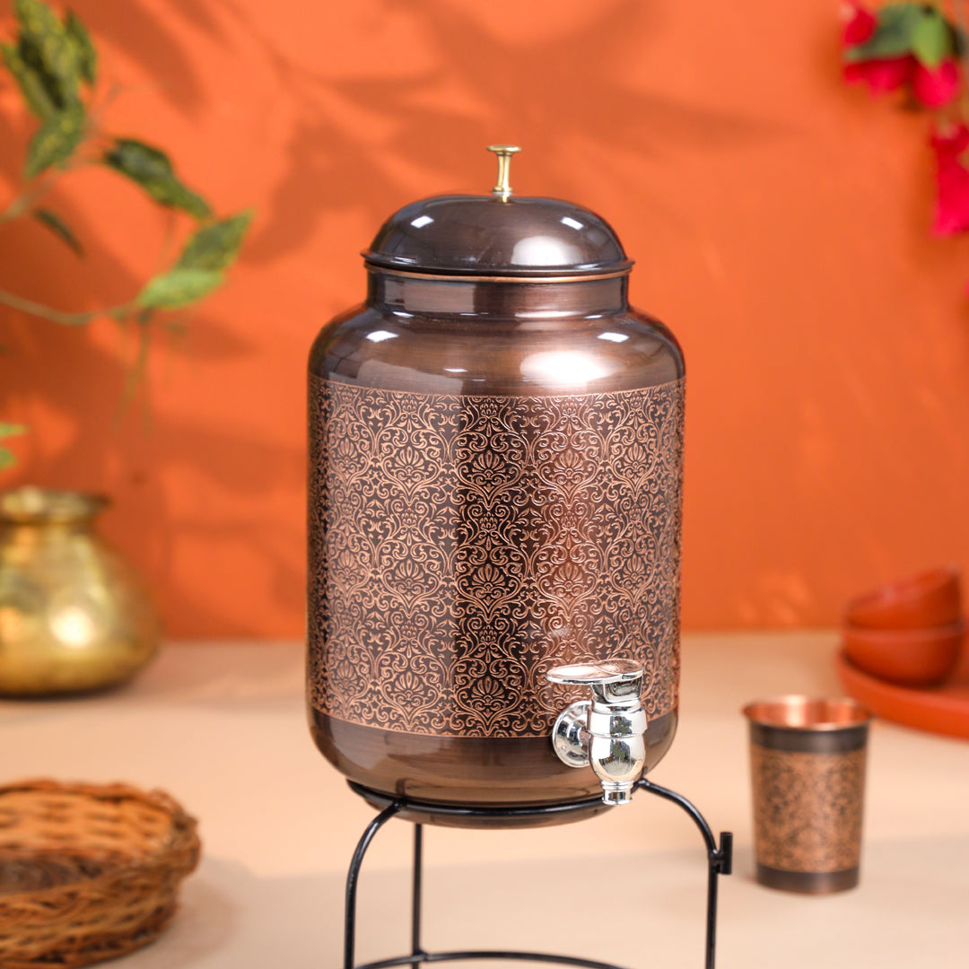 Add elegance and wellness to your home with this stunning Copper OLIVE Water Dispenser with Glass and Stand, a perfect blend of traditional Indian brassware and modern utility. Handcrafted by skilled artisans, this dispenser is designed with a hammered copper band and deep olive-red finish, giving it a unique, premium appeal that instantly enhances your kitchen or dining space.