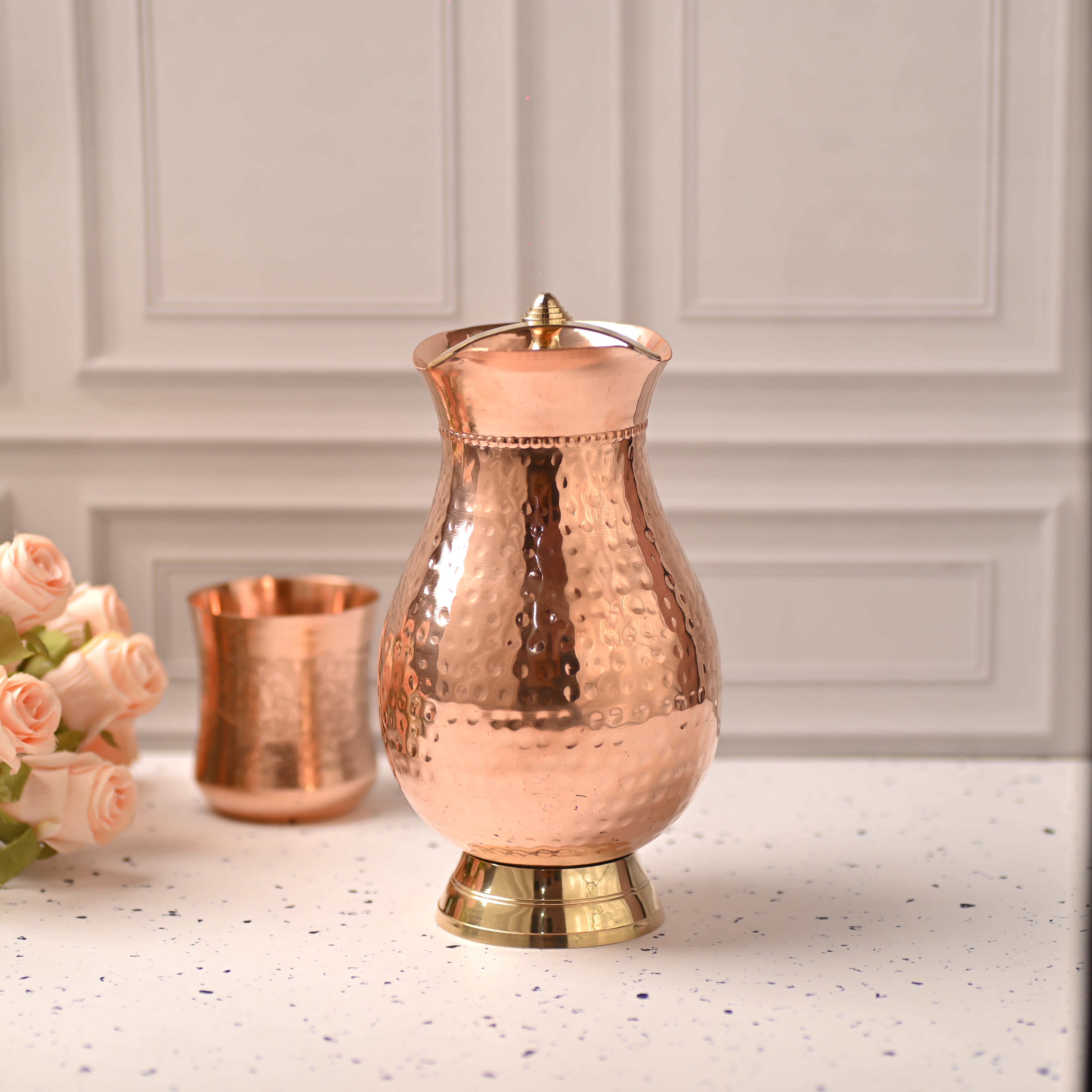 Bring home timeless elegance and wellness with this Premium Copper Jug with Lid, a perfect blend of tradition and craftsmanship. Handcrafted by skilled Indian artisans, this exquisite piece of traditional Indian brassware reflects centuries-old metalworking heritage. Made from high-quality pure copper, it not only enhances your kitchen aesthetics but also promotes a healthier lifestyle by naturally purifying and alkalizing water.