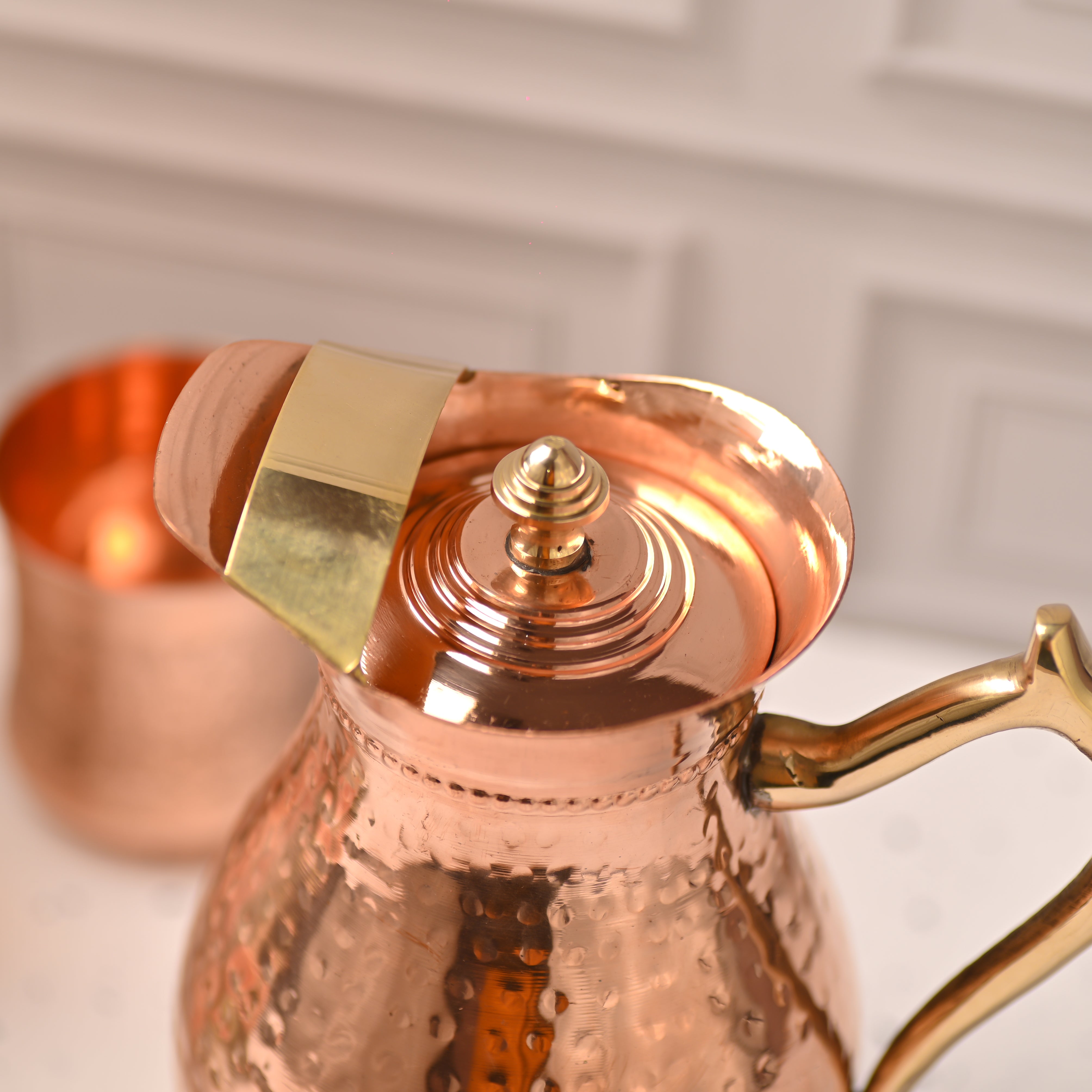 Each jug is meticulously hand-hammered and polished to perfection, embodying the artistry and devotion that define authentic Indian copper handicrafts. Its sturdy lid helps retain freshness while preventing dust or impurities from entering, making it ideal for everyday use or gifting.