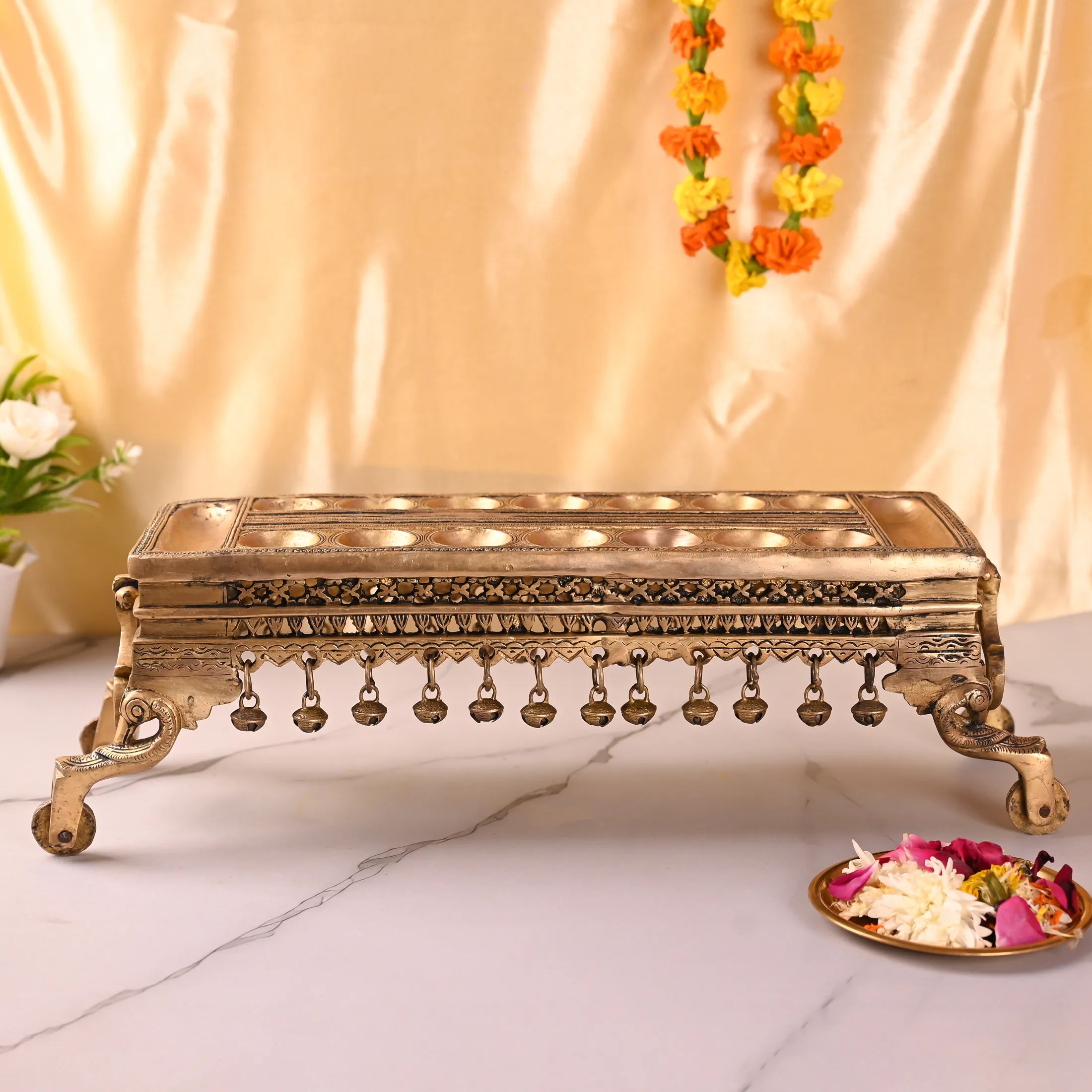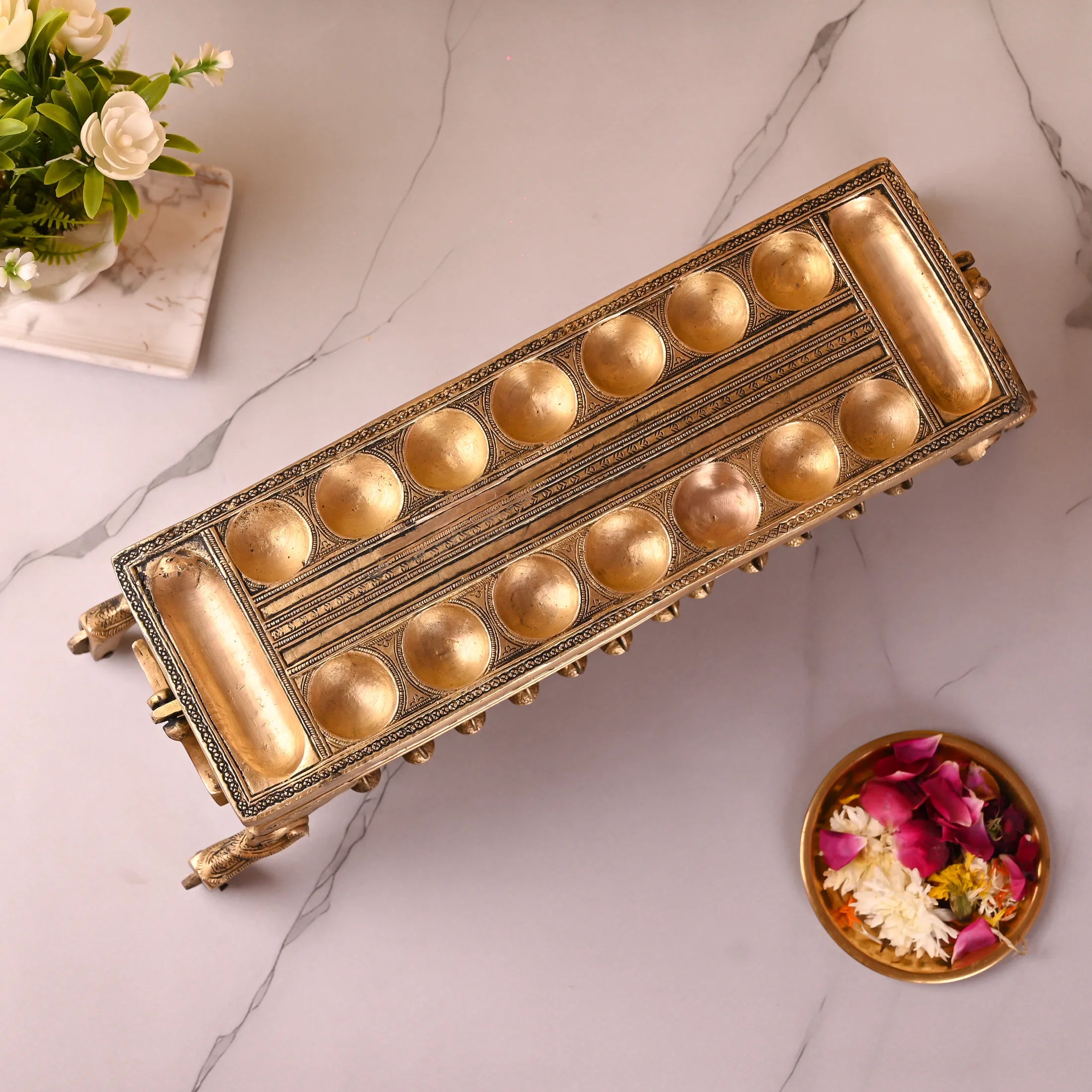 Celebrate India’s timeless gaming tradition with this beautifully handcrafted Brass Pallanguzhi Game Board with Wheels, a perfect fusion of culture, craftsmanship, and premium brass decor. Rooted in South Indian heritage, Pallanguzhi is a traditional strategy game believed to enhance focus, intelligence, and memory. This exquisite brass game board not only revives that ancient charm but also serves as a stunning collectible for lovers of traditional Indian brassware.