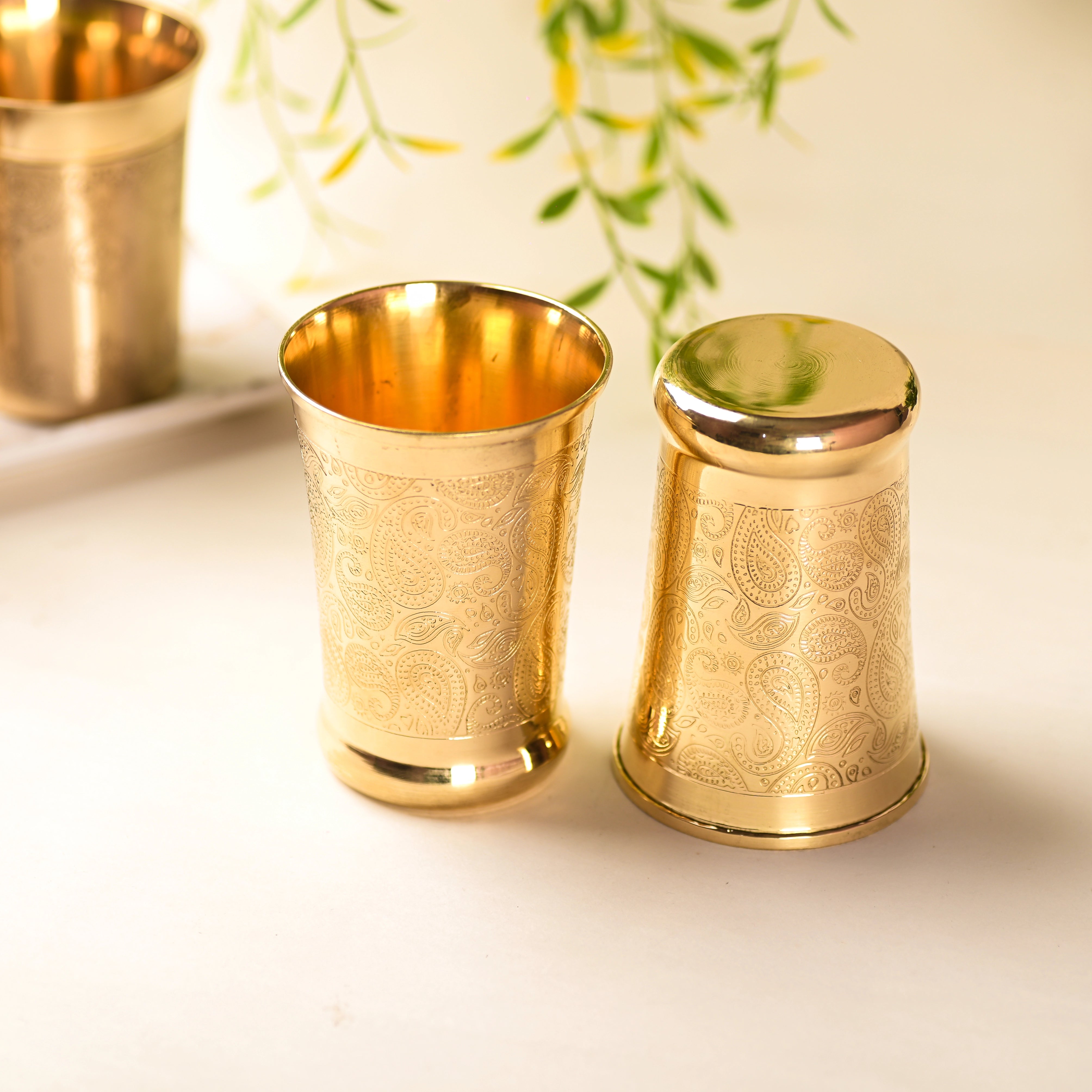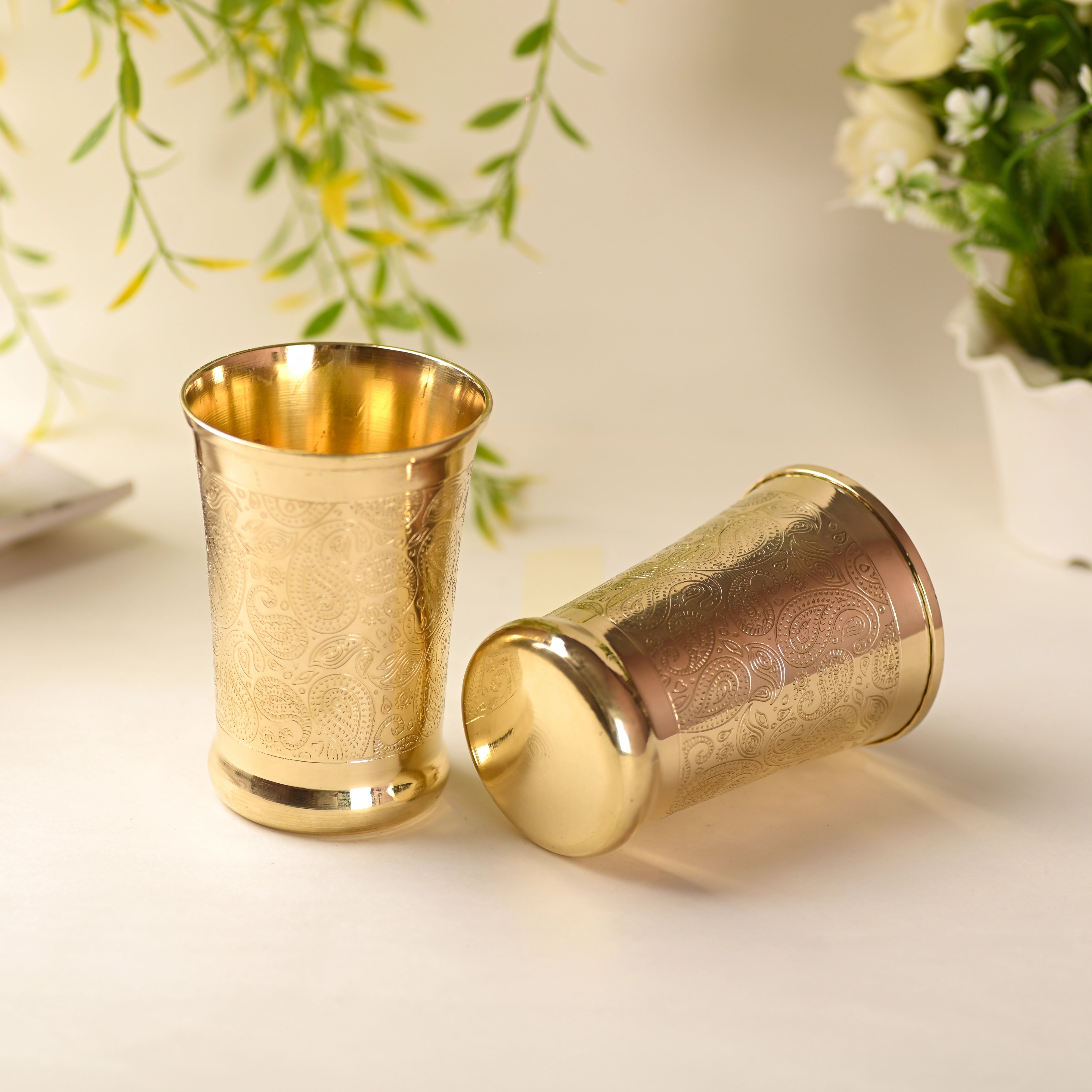 Perfect for serving water, milk, or festive beverages, these brass glasses are also revered in Indian tradition for their believed health and spiritual benefits. Their solid weight and balanced design ensure comfortable everyday use while adding a touch of regal charm to your table setting, pooja room, or gifting collection.