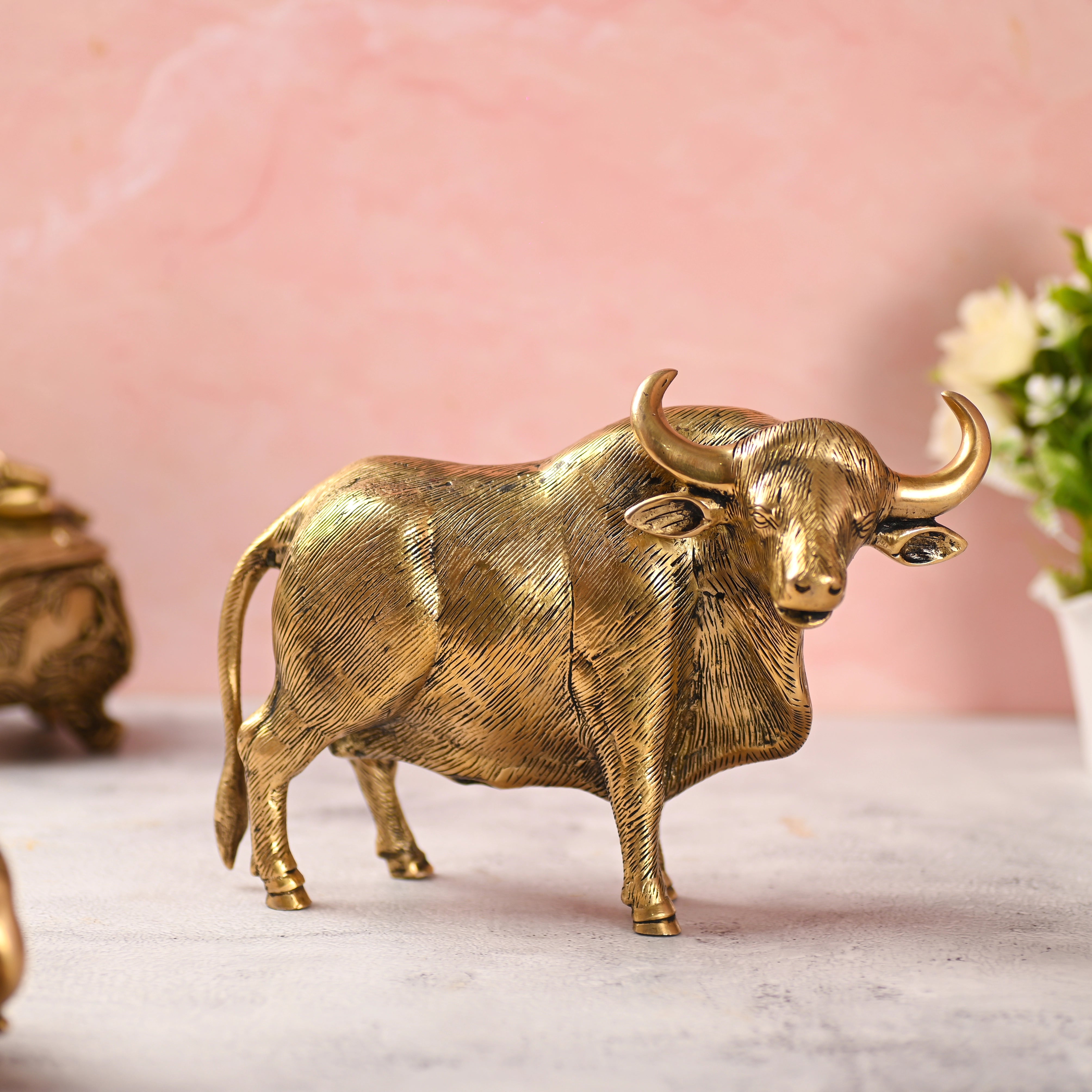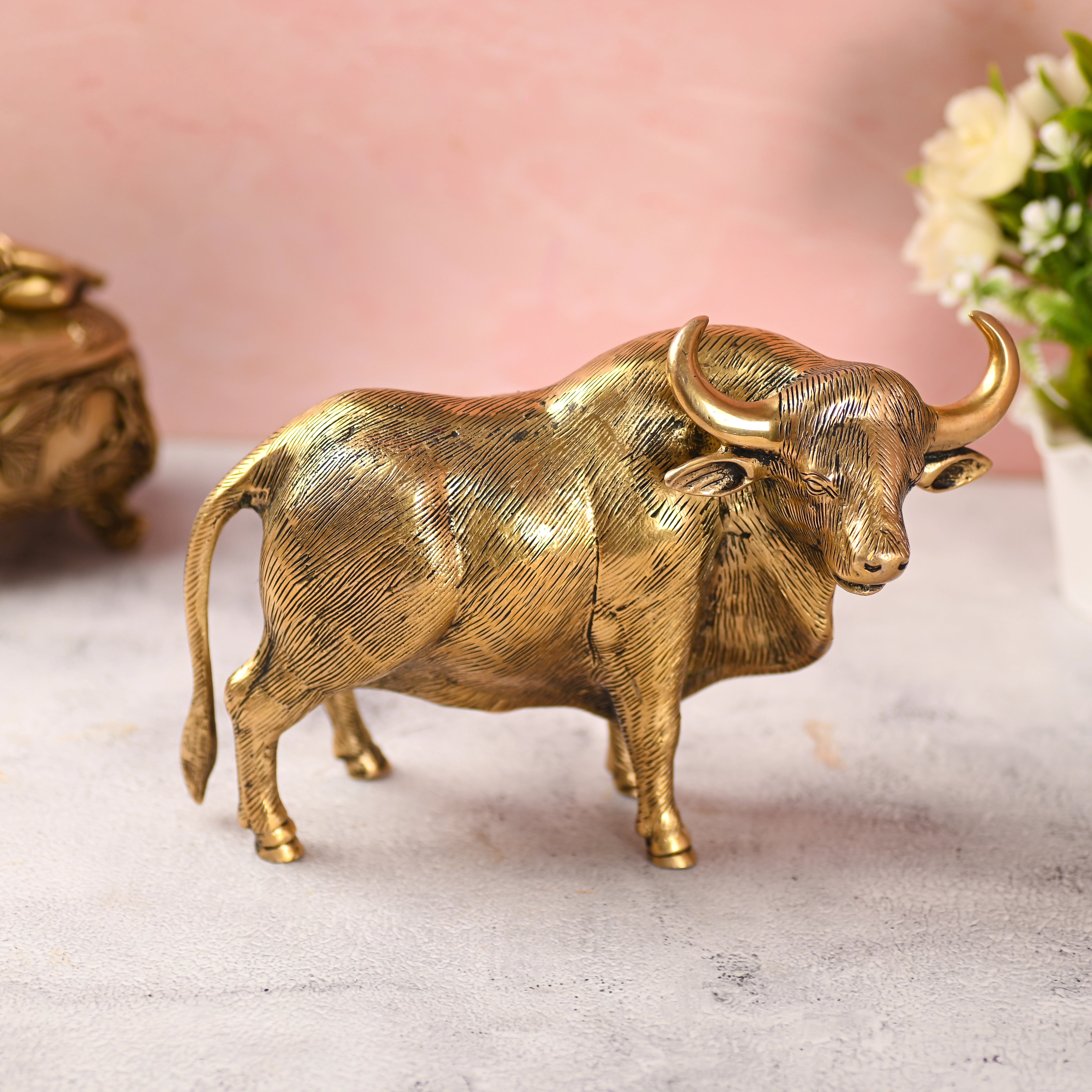 Bring home a powerful symbol of strength, prosperity, and steadfastness with this Brass Standing Bull Figurine, a timeless piece of traditional Indian brassware. Meticulously handcrafted by skilled Indian artisans, this figurine reflects generations of metalworking expertise and cultural heritage. Every curve, texture, and detailing is shaped by hand, making each piece truly one of a kind.
