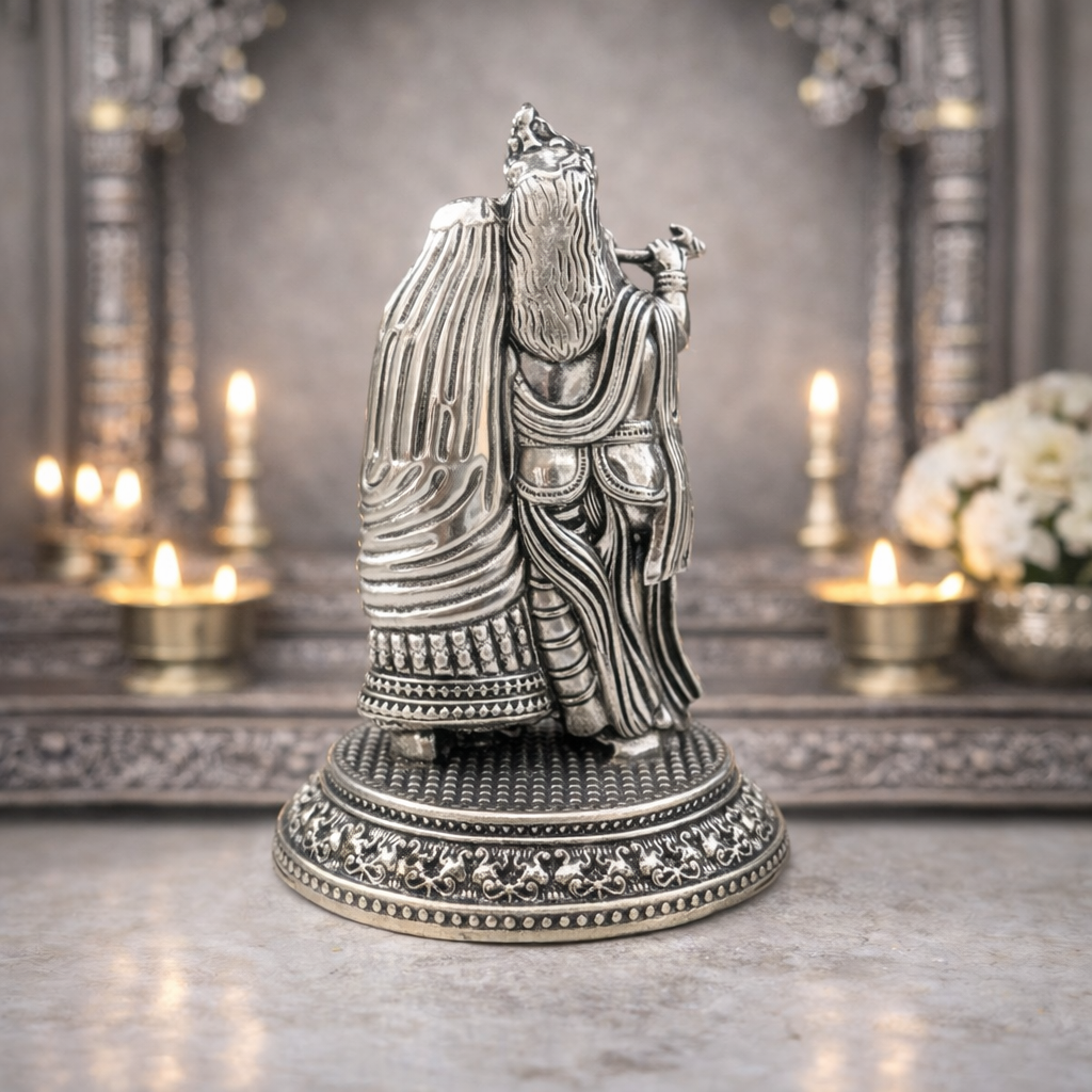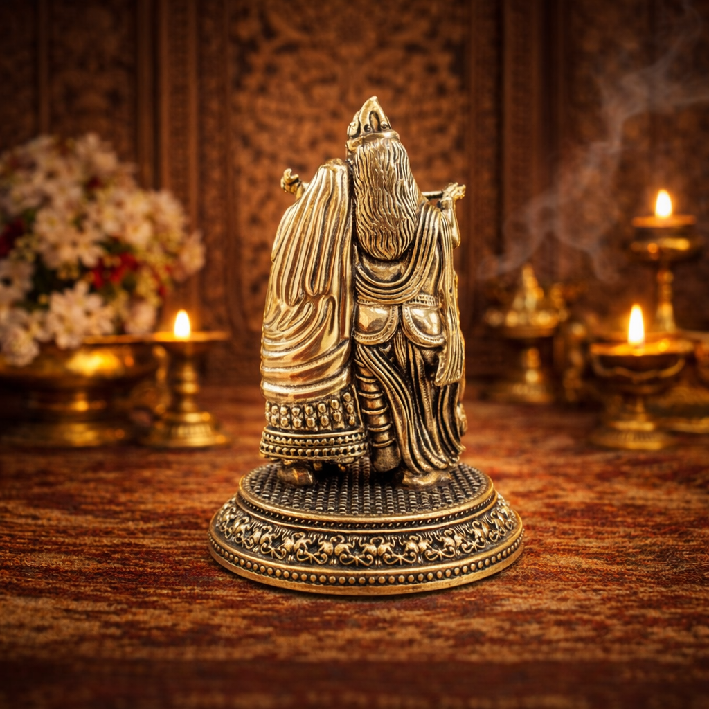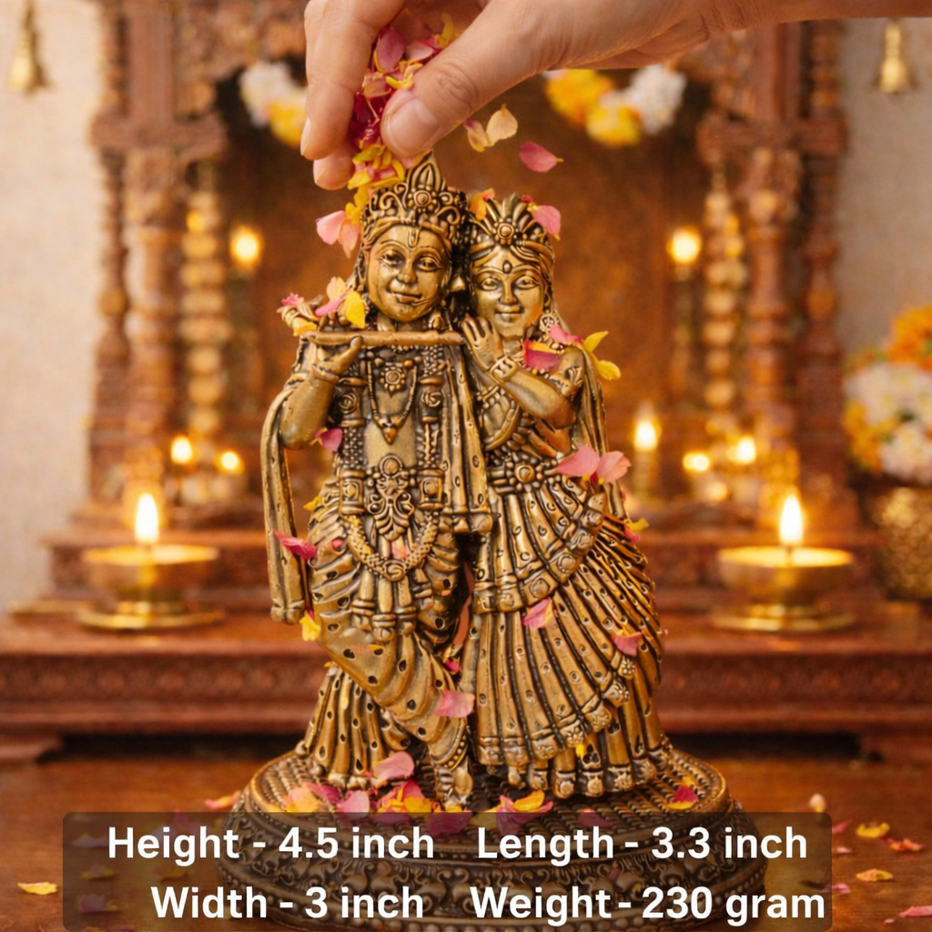 The idol portrays Lord Krishna with Radha in an elegant standing posture, representing spiritual unity and divine love. Its intricate carvings, balanced proportions, and radiant brass finish make it a perfect addition to your home temple, meditation space, or premium brass decor collection. Despite its solid look, the idol is designed to be lightweight, making it easy to place on altars, shelves, or decorative corners.