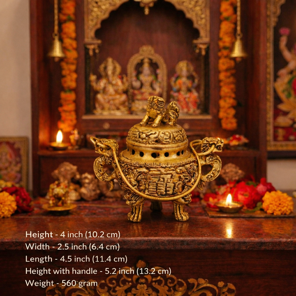 Meticulously created by skilled artisans, this traditional Indian brassware showcases intricate detailing and a sturdy handle for safe and convenient use during pooja, meditation, or daily rituals. The warm golden glow of pure brass enhances the spiritual ambiance, while the functional design allows you to easily carry burning dhoop or incense around your home or temple.