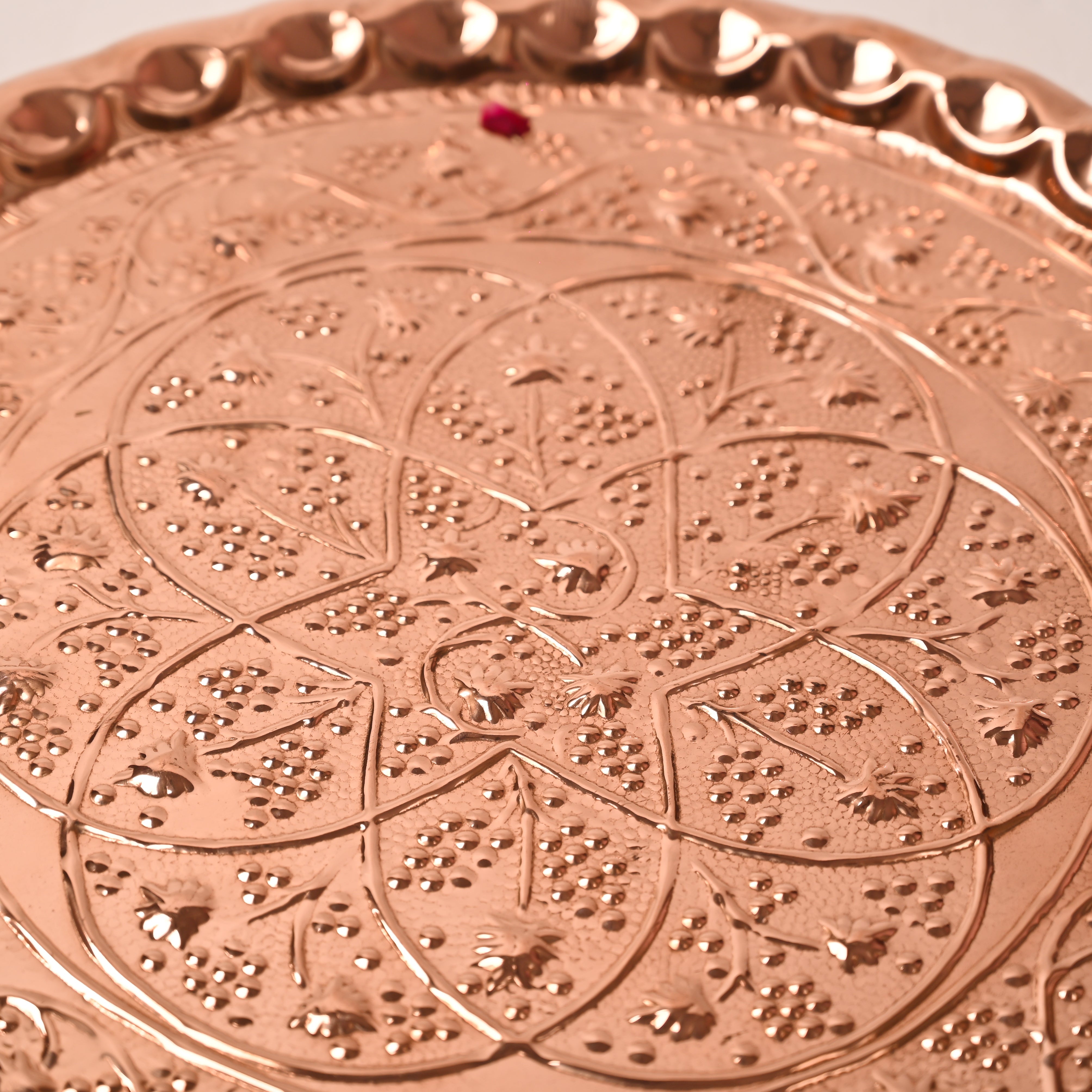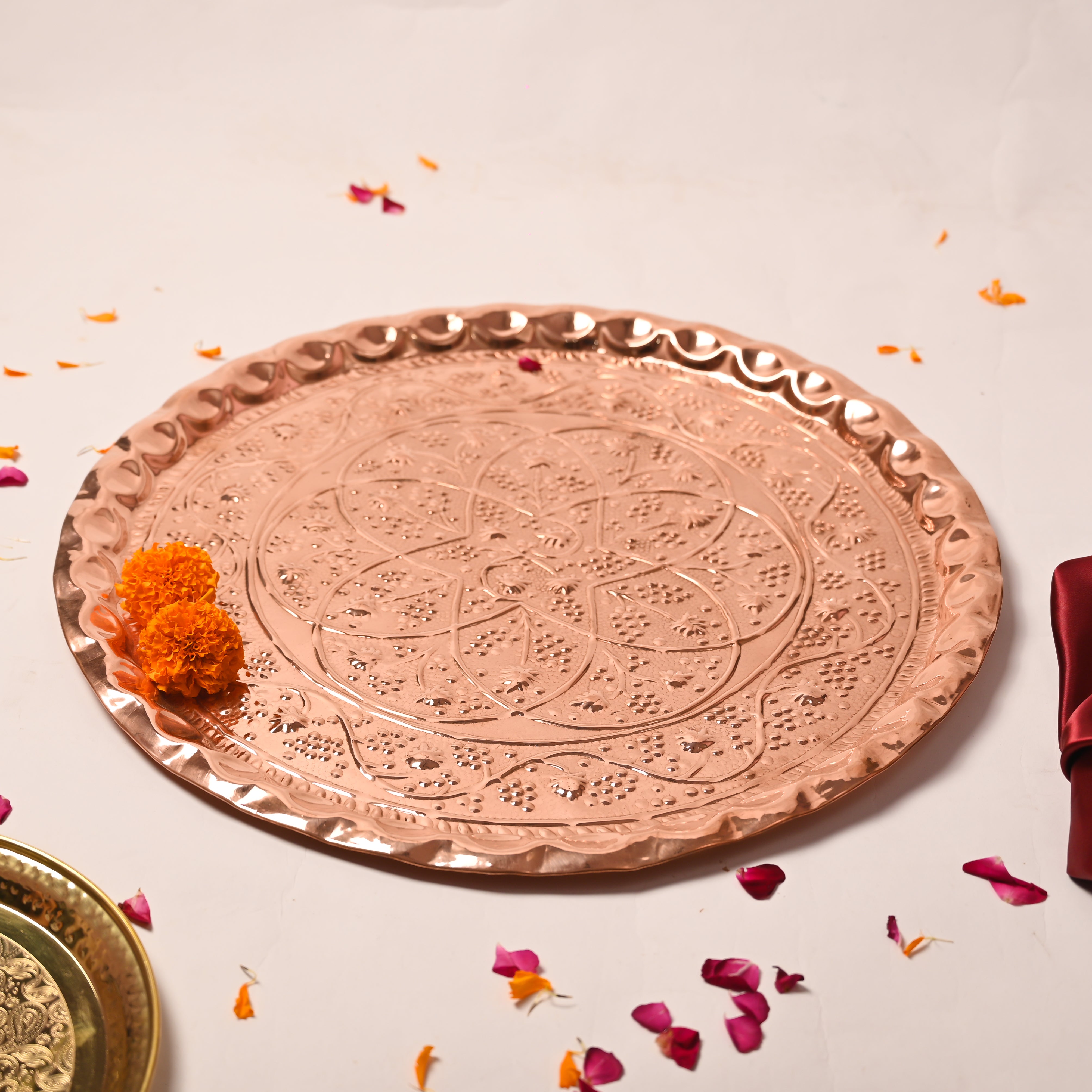 Embrace divine tradition and timeless craftsmanship with this Handcrafted Copper Pooja Thali, a stunning creation that beautifully reflects India’s rich spiritual and artistic heritage. Expertly made by skilled artisans, this thali is a fine example of traditional Indian brassware and metal artistry. Crafted from high-quality copper, it shines with a warm, auspicious glow—perfect for performing daily pooja rituals, festive ceremonies, or temple offerings.