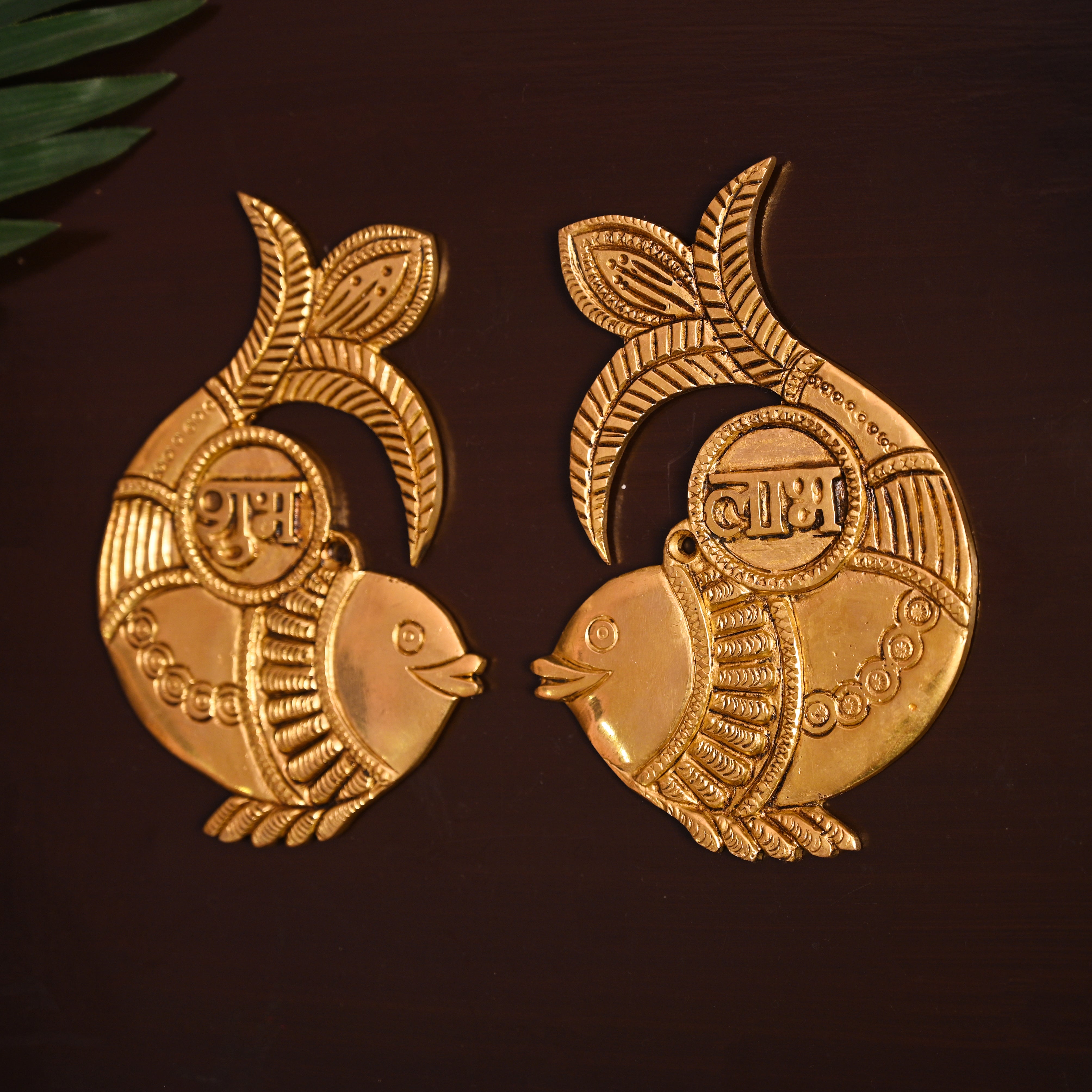 Exquisite brass “Shubh Labh” wall hanging with fish design and bells