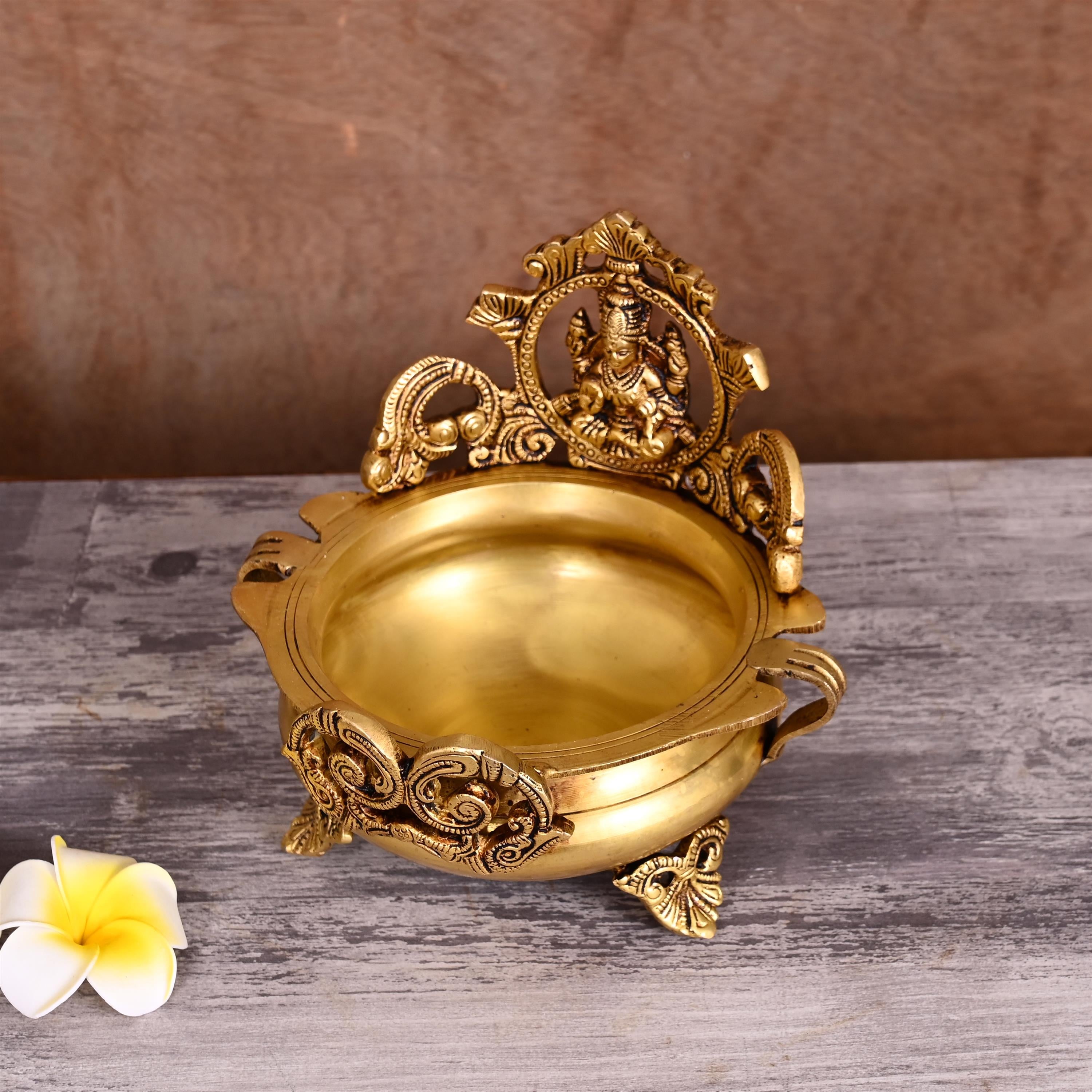 This beautifully engraved oil lamp with a central blessing Lakshmi is handcrafted by artisans of India from excellent quality brass. This Blessing Lakshmi Urli is the perfect festival Gift Item For Diwali, And Other Auspicious Puja Occasions. House warming gift, Christmas gift for your near and dear ones.