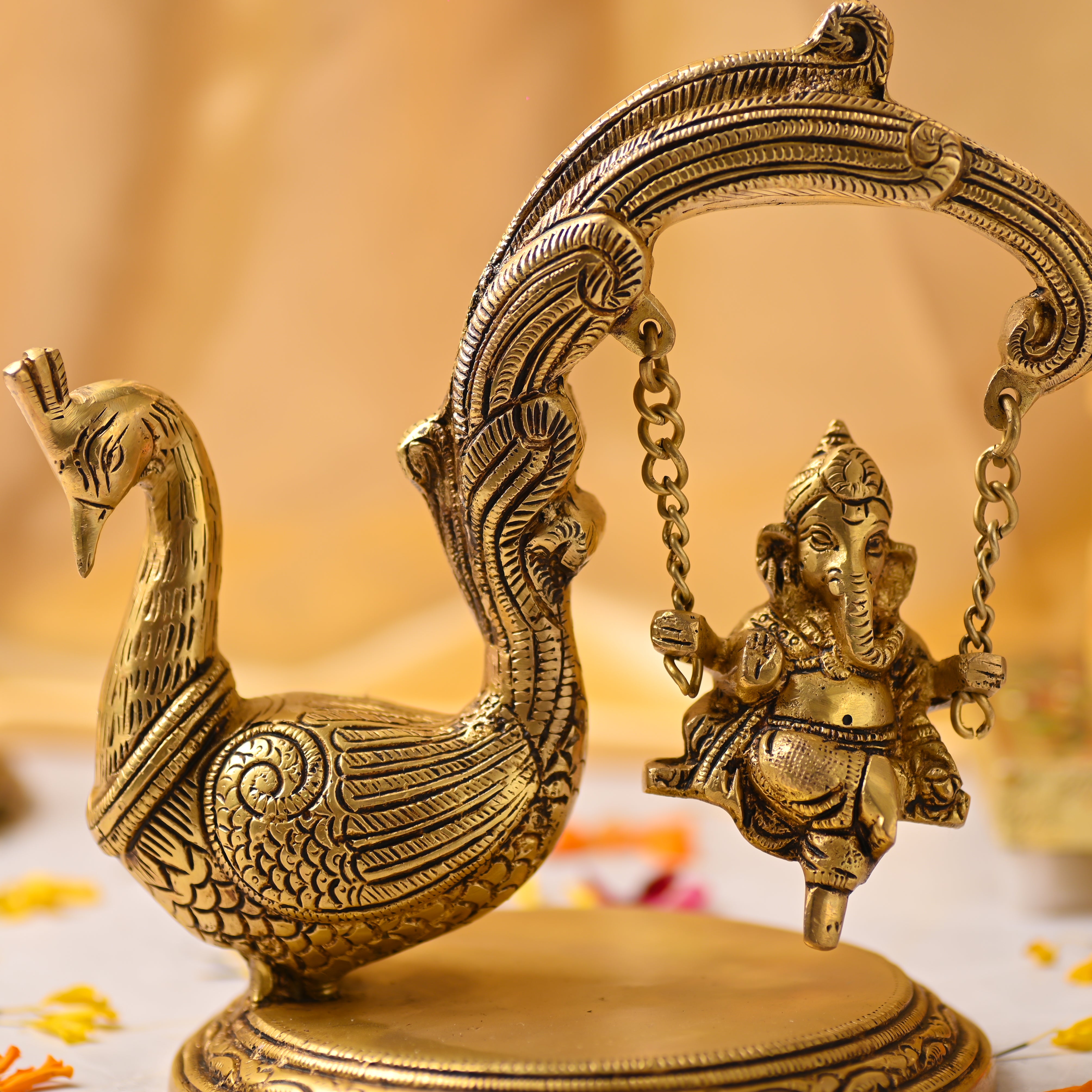 Bring charm, spirituality, and elegance to your home with this handcrafted Brass Peacock Jhula with Ganesha Idol. Expertly made by skilled artisans, this stunning piece of traditional Indian brassware beautifully combines the auspicious presence of Lord Ganesha with the grace of intricately designed peacocks on a swinging jhula. Each piece is a unique brass handicraft, showcasing meticulous craftsmanship and cultural artistry, with natural variations in color and finish that enhance its authenticity.