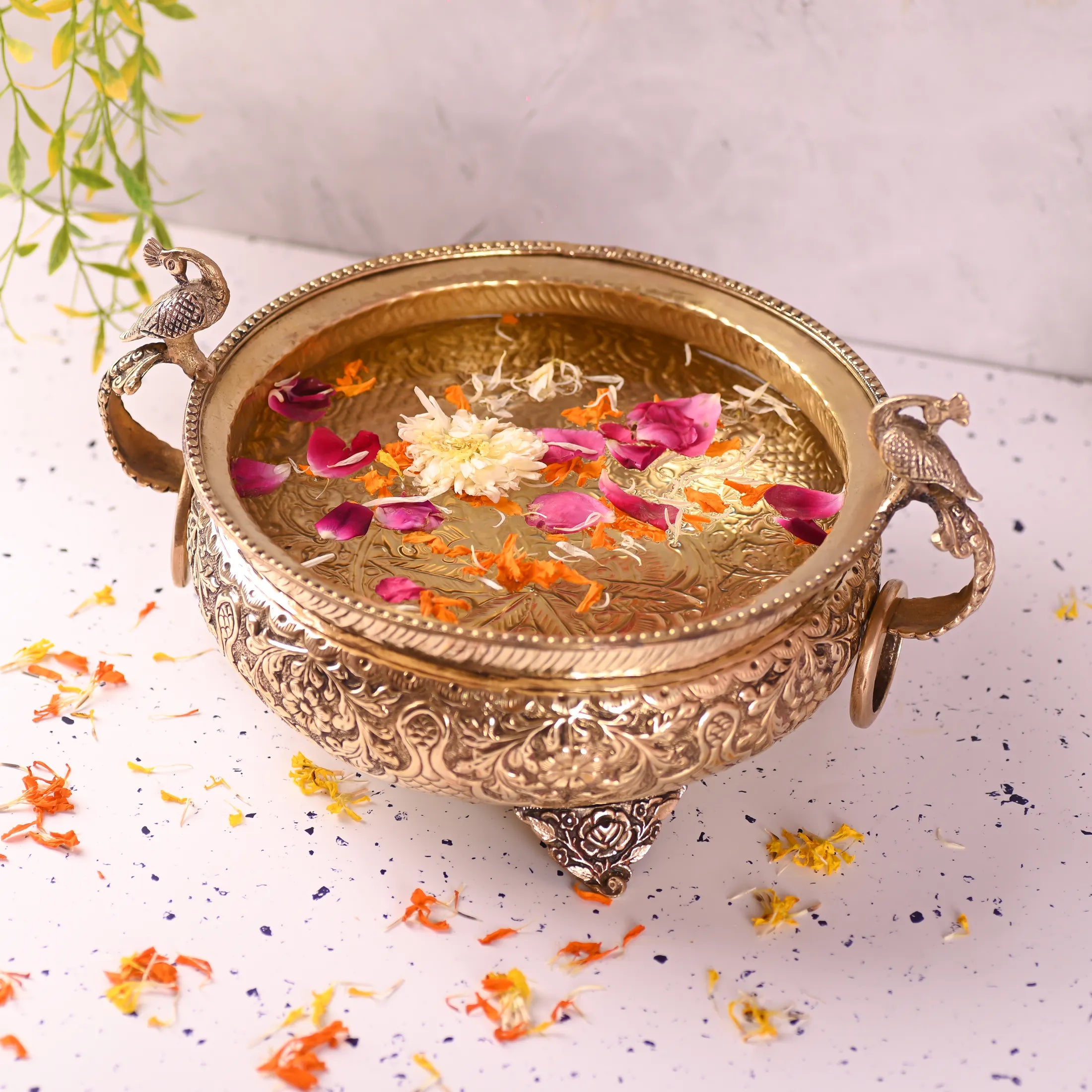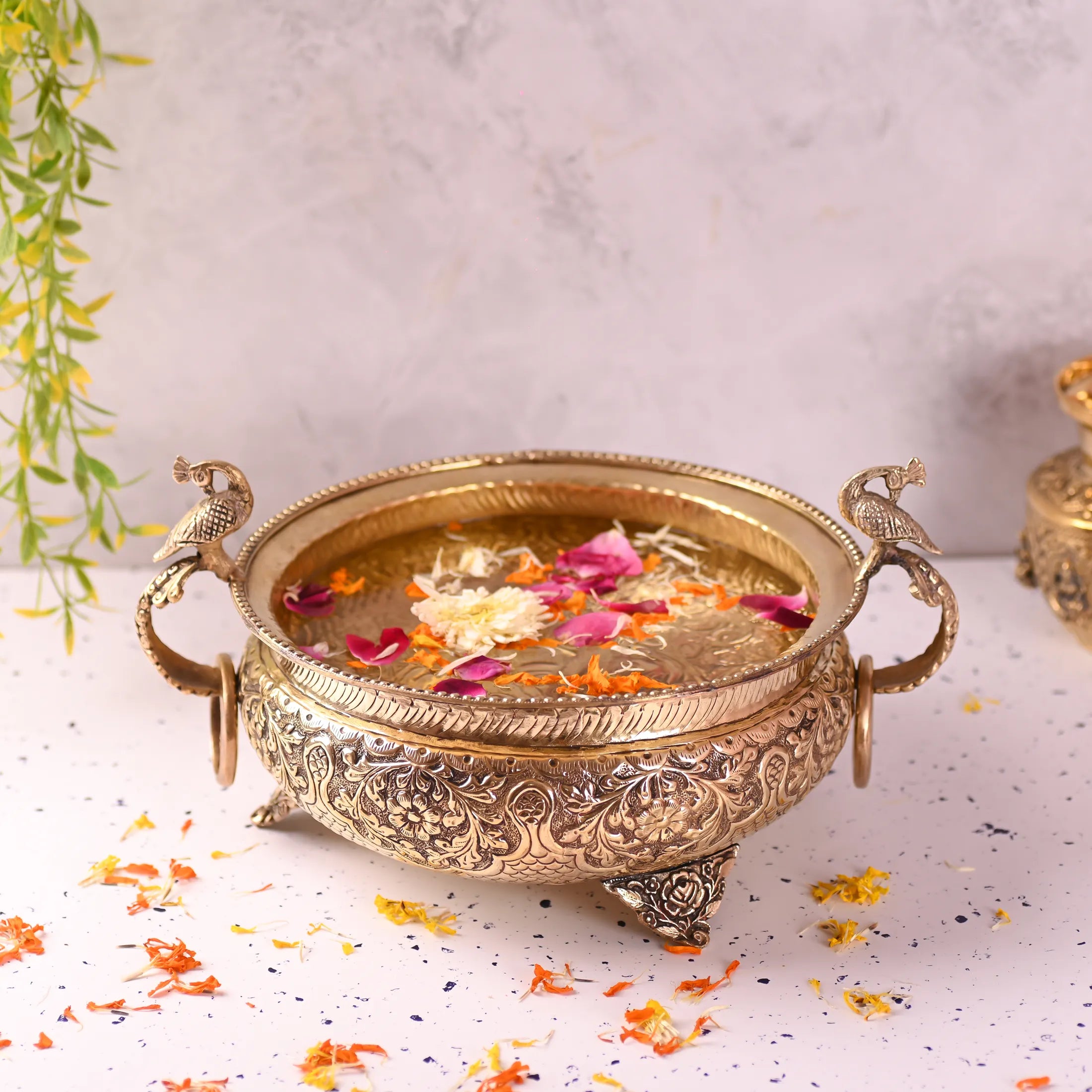 Elevate your home decor with the timeless beauty of the Brass Majestic Peacock Urli, a stunning blend of artistry, tradition, and functionality. The peacock, a revered symbol of grace, prosperity, and positivity in Indian culture, lends this urli a regal charm that instantly enhances any space. Traditionally used to float flowers, petals, or diyas, this urli is perfect for festive decor, pooja settings, and welcoming entrances.
