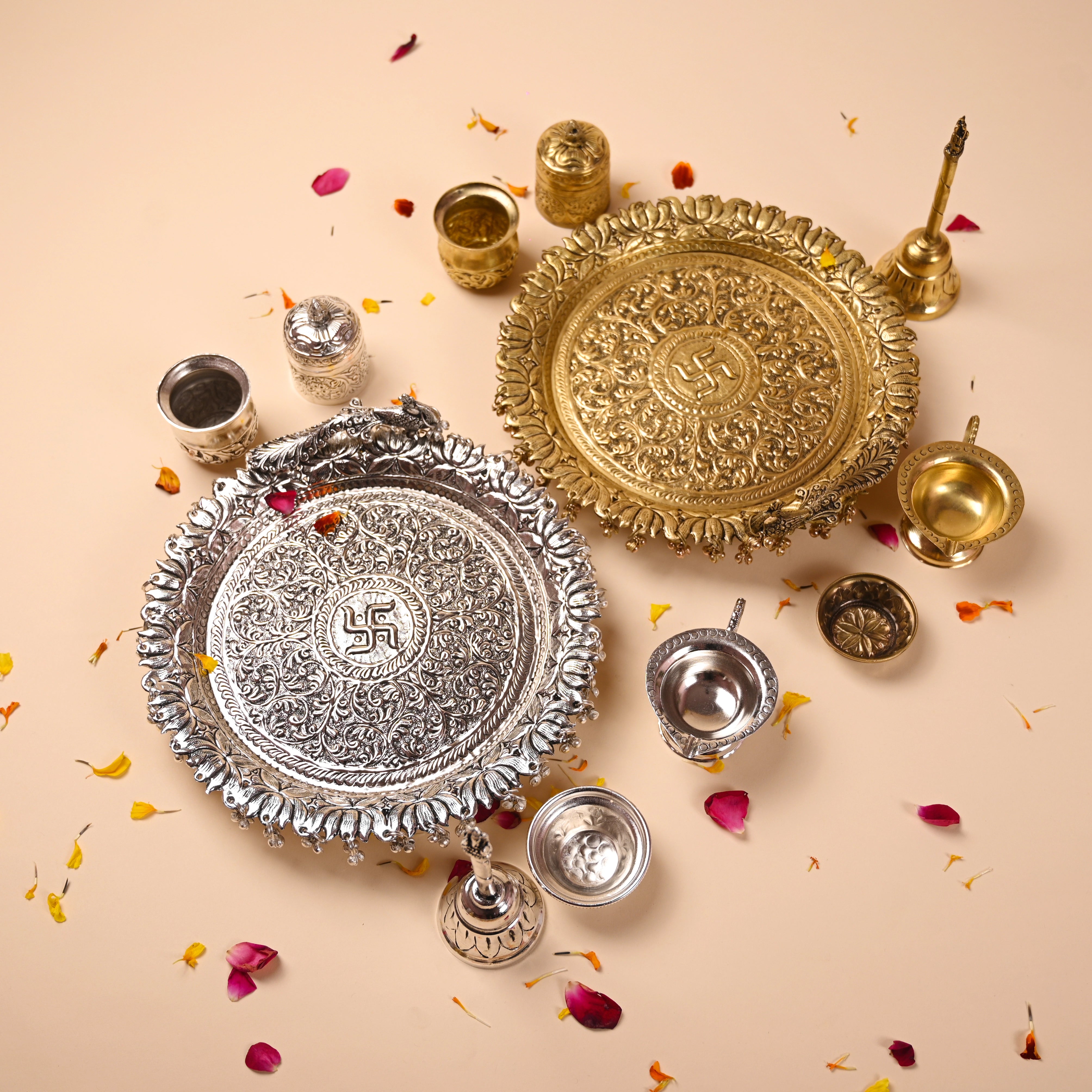 Quantity - 1 set (1 Pooja Thali, 1 Handle Diya, 1 Kumkum box, 1 Bowl, 1 Kalash, 1 Handbell)