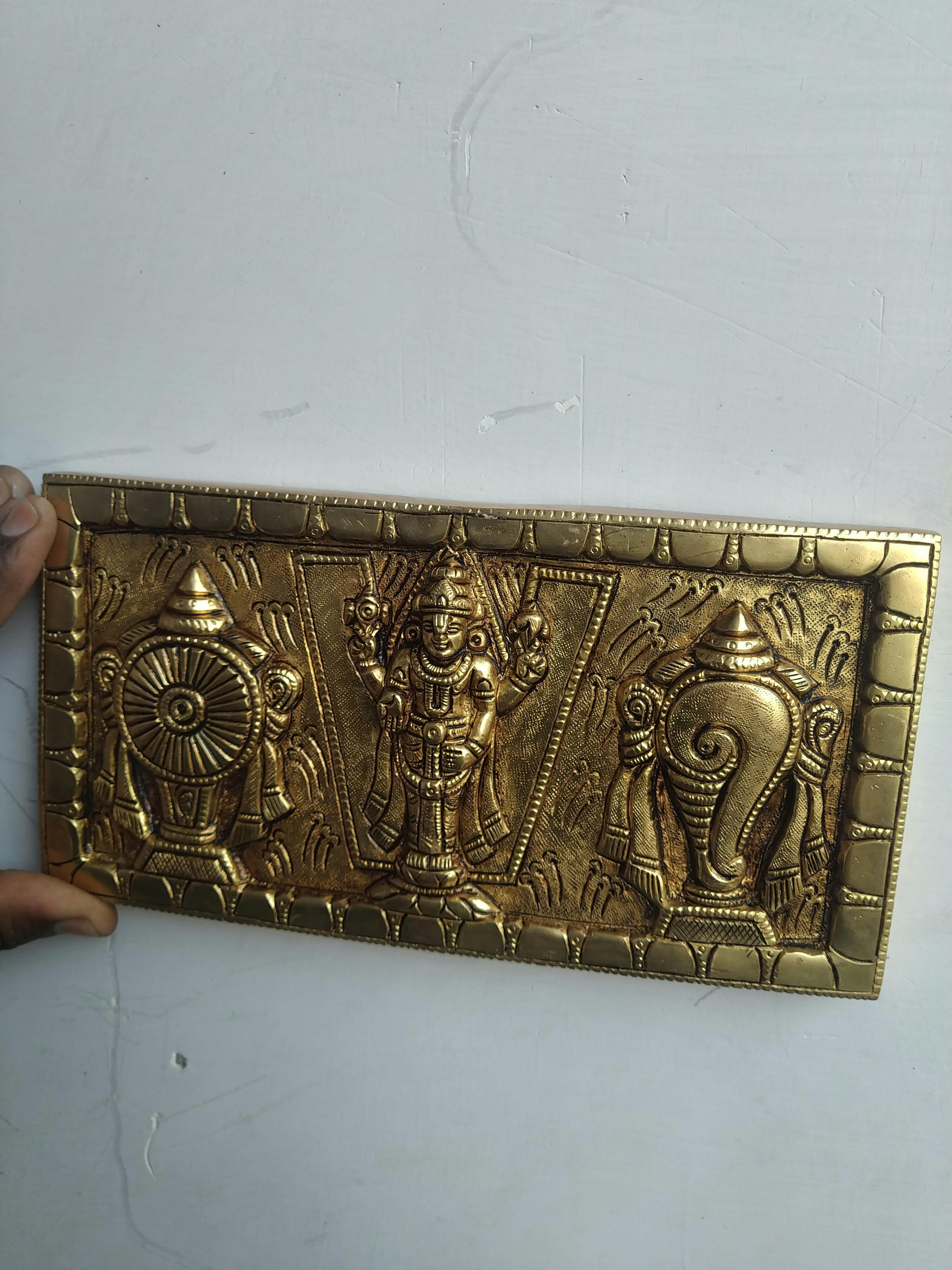 This Balaji, Shankh, Chakra, and Namah wall hanging have been crafted in pure brass by the skilled artisans of VEDANSH CRAFT. This auspicious piece is to hang on the Pooja Altar, home, or office and can be gifted to near and dear ones on special occasions. This has symbols that are highly revered by Lord Vishnu devotees as they represent Lord Venkateshwara or Lord Balaji.