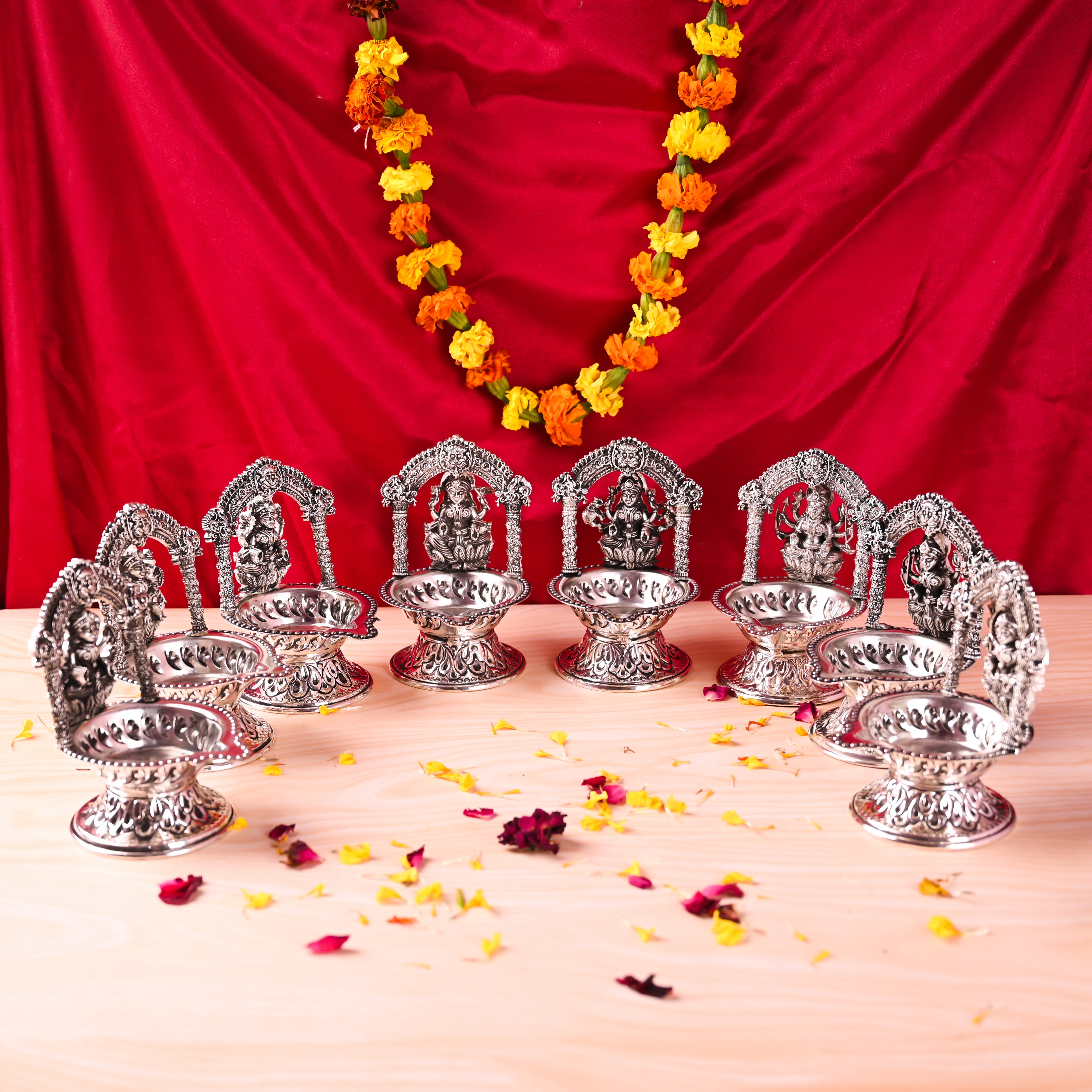 Illuminate your home with the sacred brilliance of this Brass Silver Plated Ashtalakshmi Diya Set, a stunning fusion of traditional artistry and luxurious design. Embellished with the eight divine forms of Goddess Lakshmi, this diya set symbolizes wealth, knowledge, courage, fertility, and overall prosperity. Its shimmering silver plated finish enhances the elegance of your festive decor, making it a perfect addition to any spiritual or decorative setup.