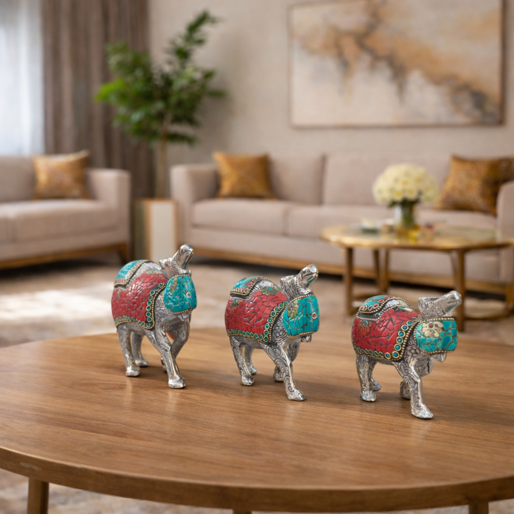Add a touch of royal elegance to your interiors with this exquisite Silver Camel Statue Set of Three, beautifully adorned with intricate stone work. Inspired by traditional Rajasthani artistry, these camels symbolize endurance, strength, and prosperity, making them a meaningful addition to your home decor or gifting collection.