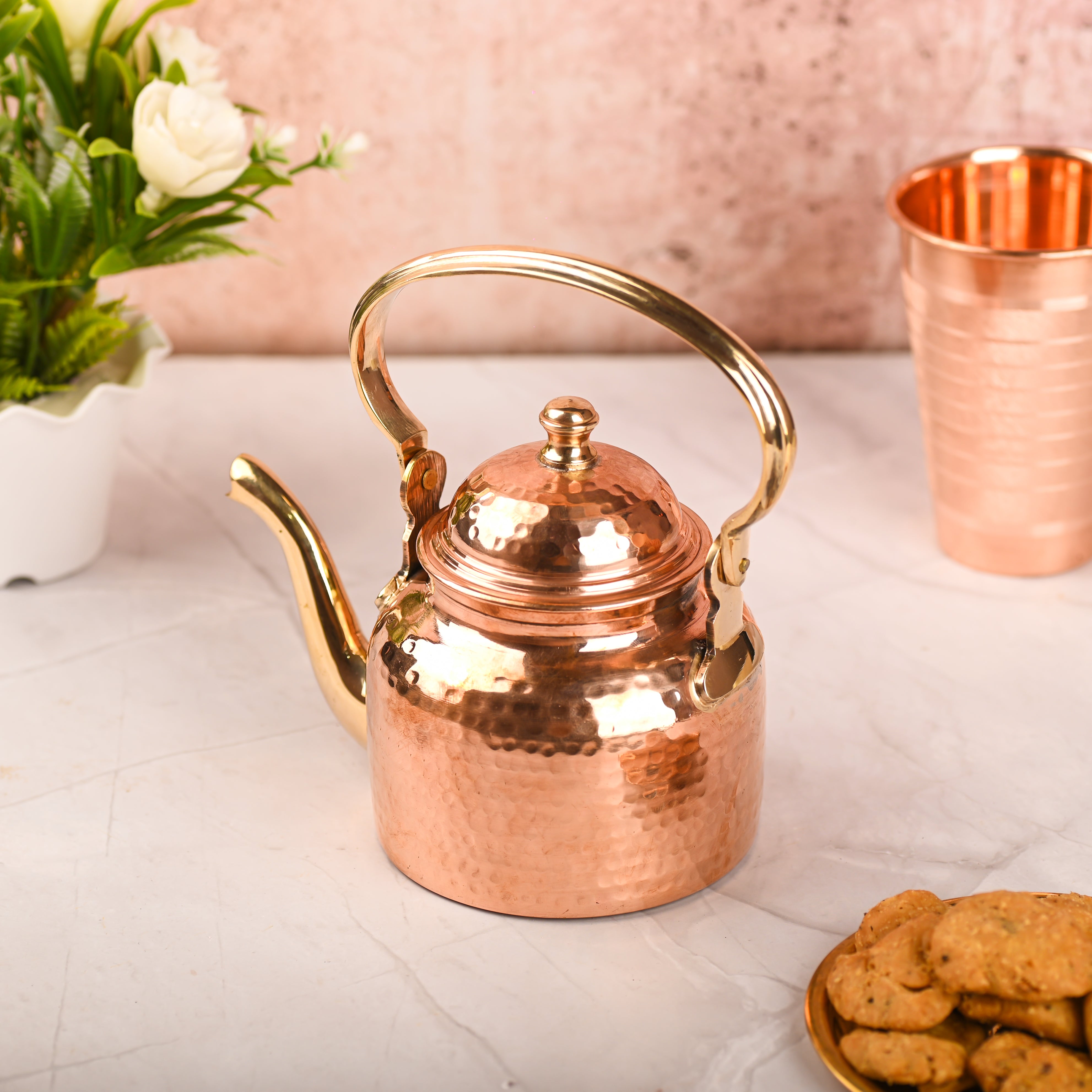 Crafted from premium quality copper, the kettle features a striking hammered finish that highlights the artistry of skilled Indian artisans. Known for its natural health benefits, copper is believed to enhance wellness when used in drinkware, making this kettle not only stylish but also purposeful. Perfect for serving tea, herbal brews, or simply as a premium brass decor piece, it elevates everyday moments into special experiences.