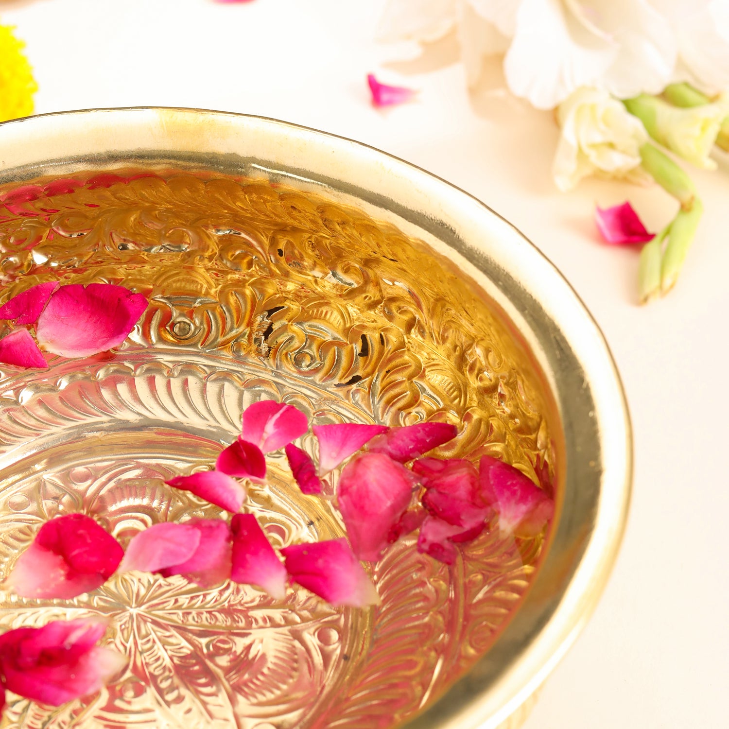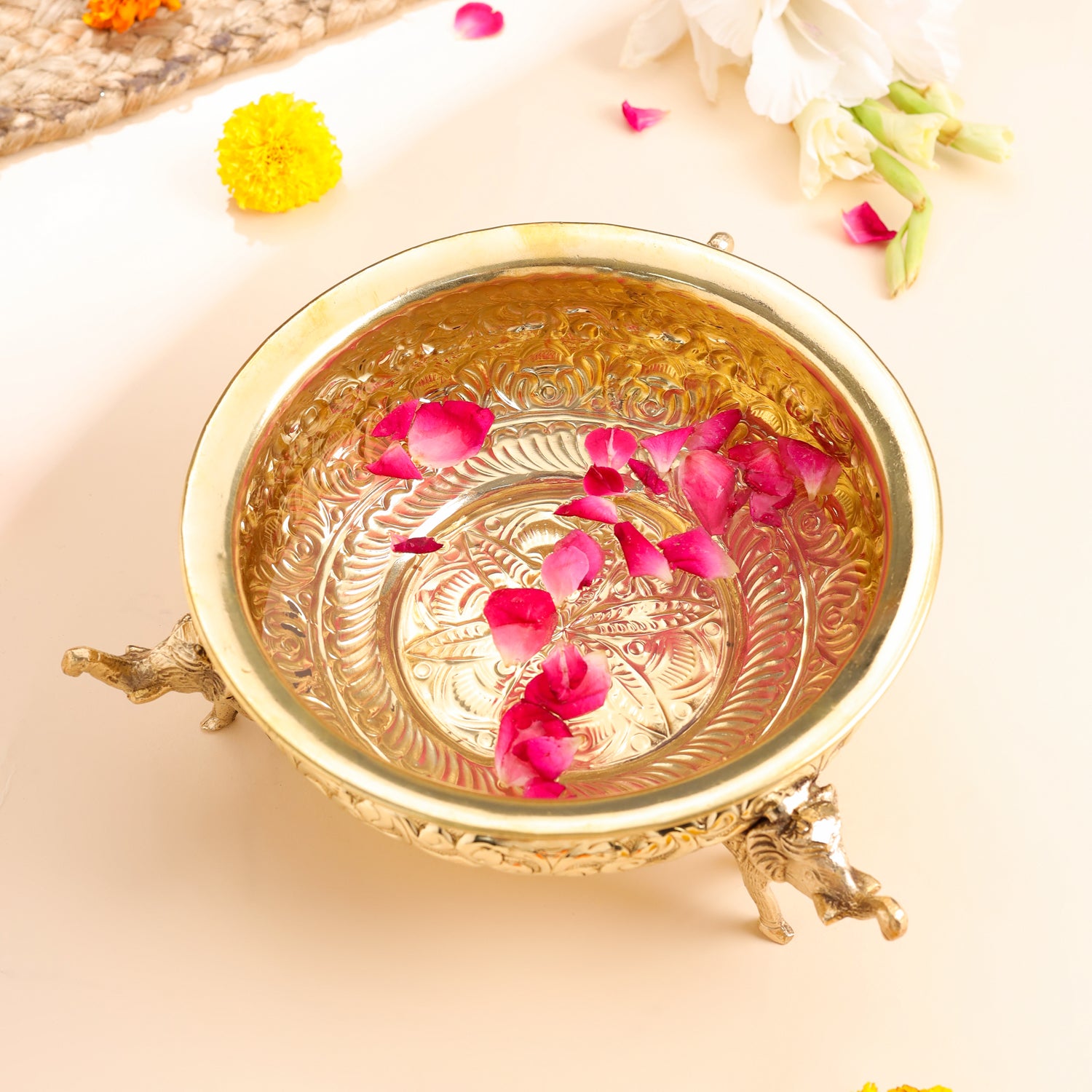 Bring home an aura of tradition and elegance with this beautifully handcrafted Brass Urli Bowl, adorned with detailed engravings and supported by intricately designed elephant legs. Ideal for festive decor, pooja rituals, or as a charming centerpiece filled with water and floating flowers, this urli combines aesthetic appeal with cultural heritage. Made from premium quality brass, its radiant golden finish adds a royal touch to your home or office space.